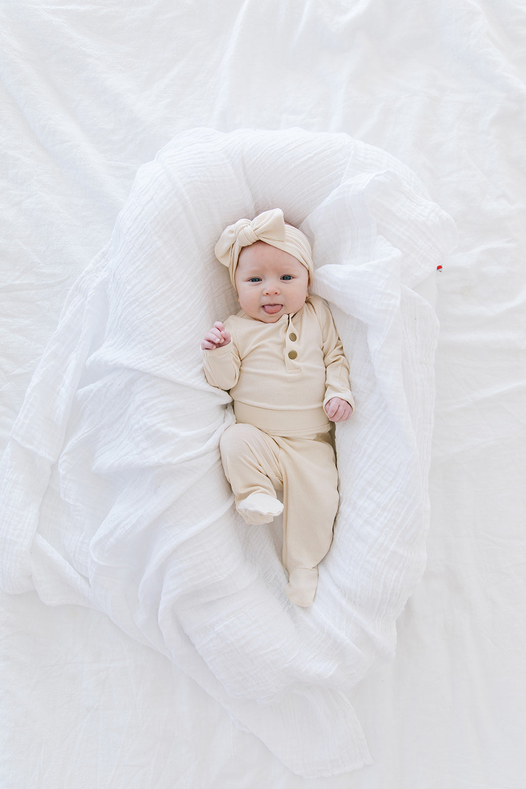 Complete your baby’s look with the Quinn St. collection. Their matching swaddles, knotted gowns, headbands, and hats are designed in complementary colors and textures, ensuring a perfectly coordinated and stylish appearance.