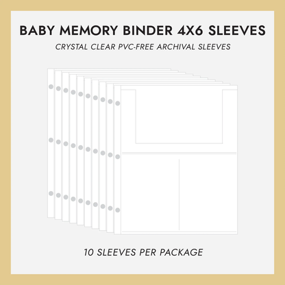 Our sleeve packs contain ten 4x6 Baby Memory Binder sleeves (for 60 photos) which fit all of our Rag & Bone Bindery Baby Memory Binders. (These sleeves do not fit our Small or Medium binders, just the Baby Memory Binders).