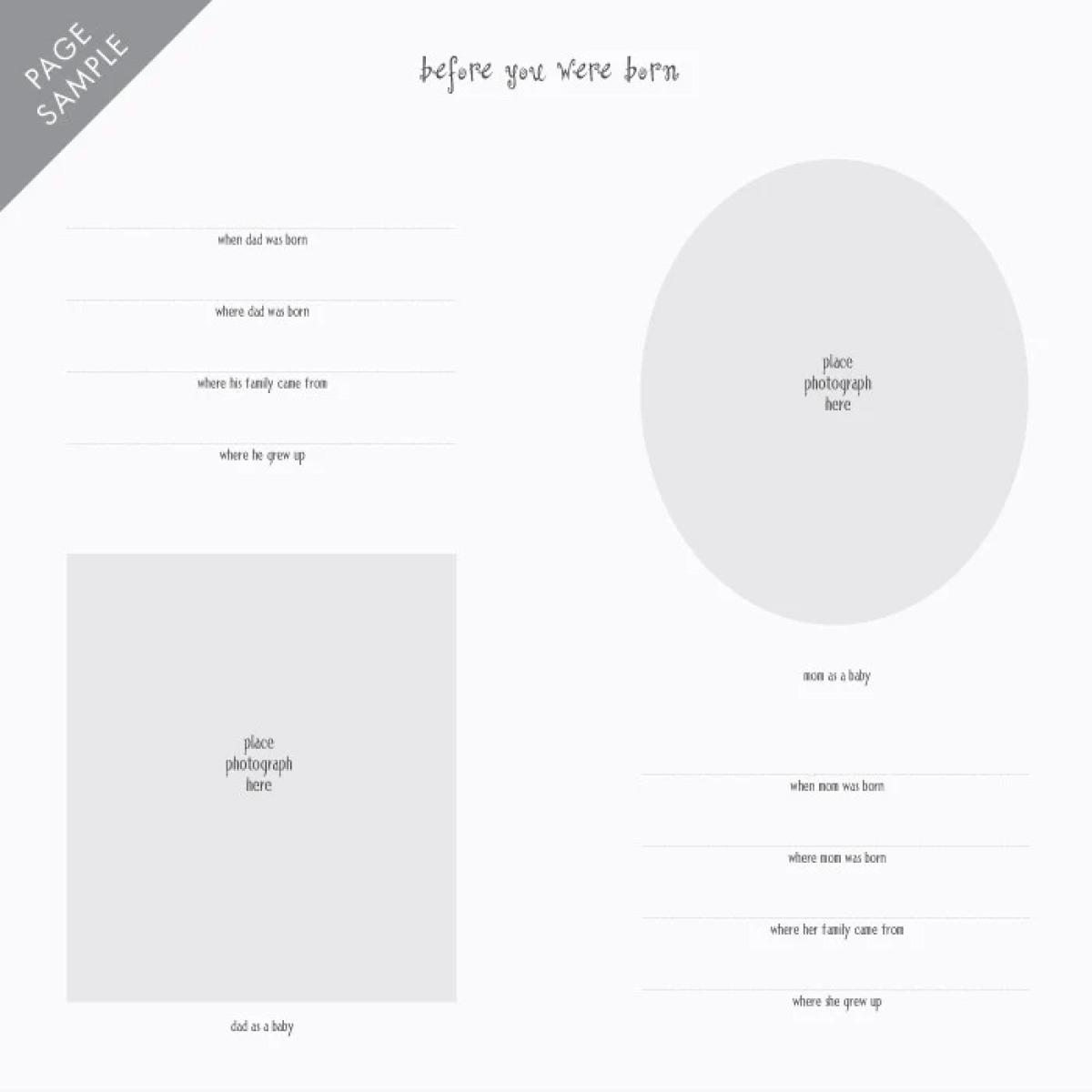 - Inside you'll find 24 pages containing fill-in prompts such as Before You Were Born, How Mom and Dad Met, The Big Day, Our Family Tree, How We Picked Your Name, Baby's World and many more. There are plenty of pages for photographs, baby's firsts, and pages to record the height and weight of your precious little one from birth to first birthday.