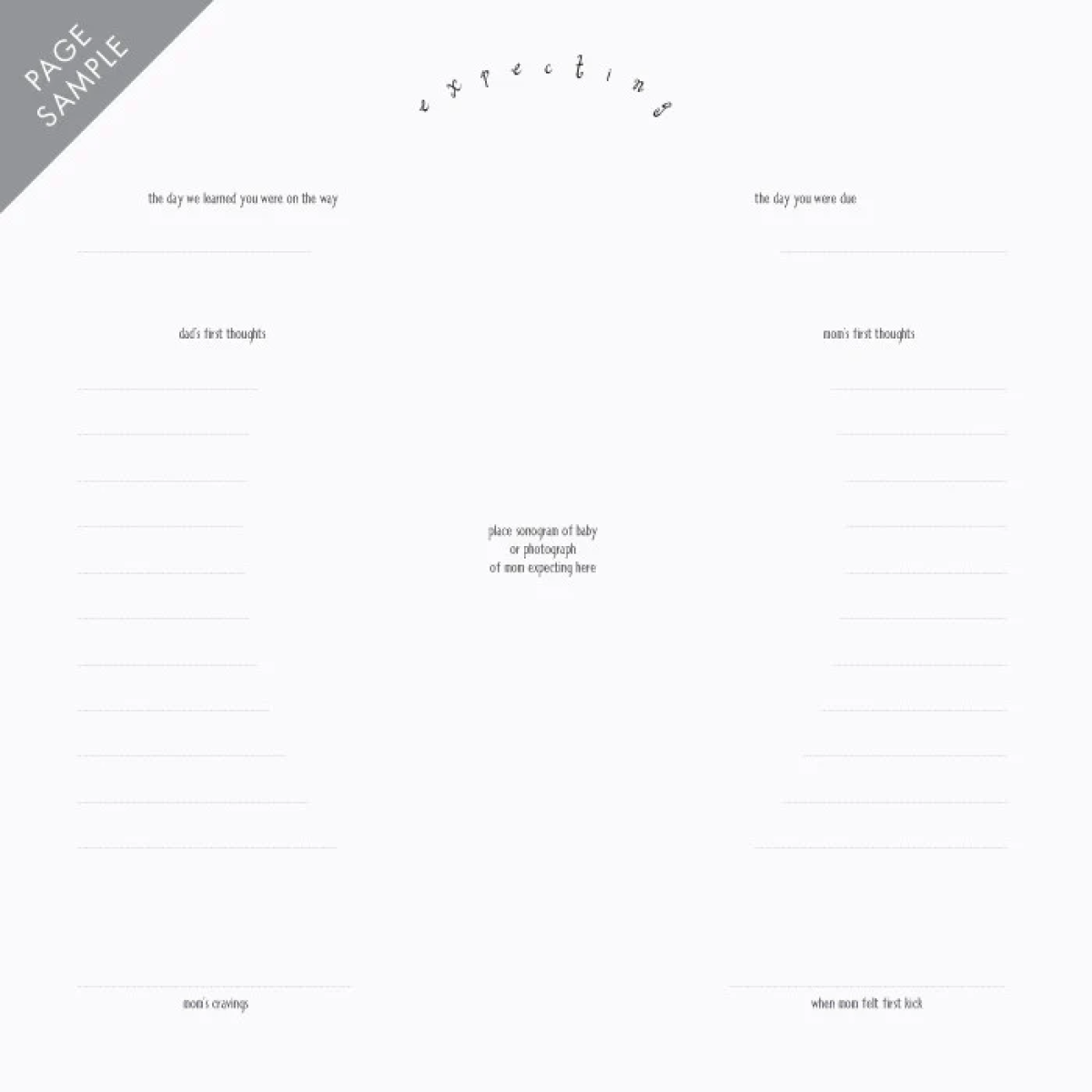 - 24 bright white, heavy-weight printed pages with prompts from birth to first birthday and room for photos. The Memories page includes a vellum envelope to capture clippings from baby's first haircut or other sweet mementos.