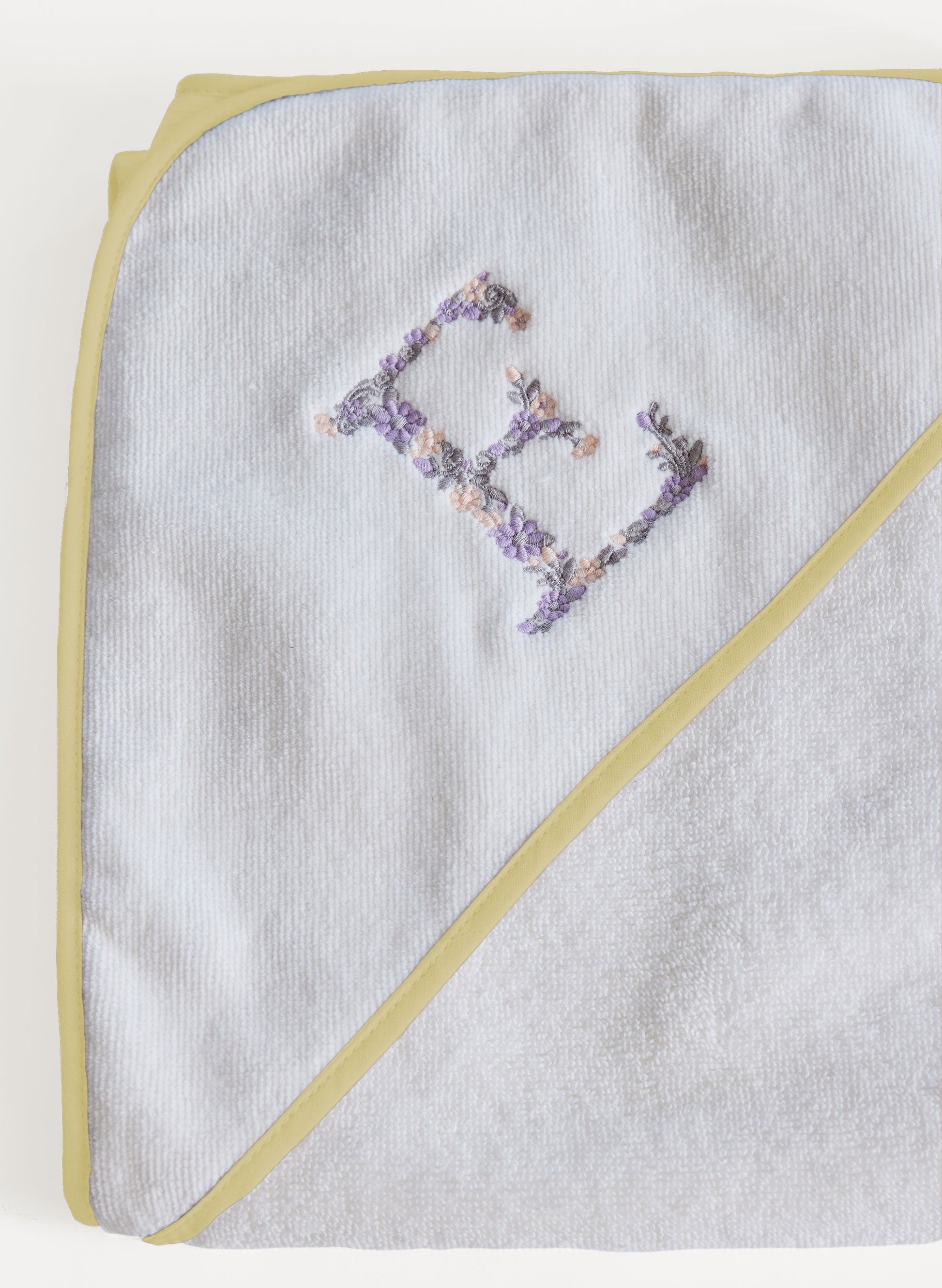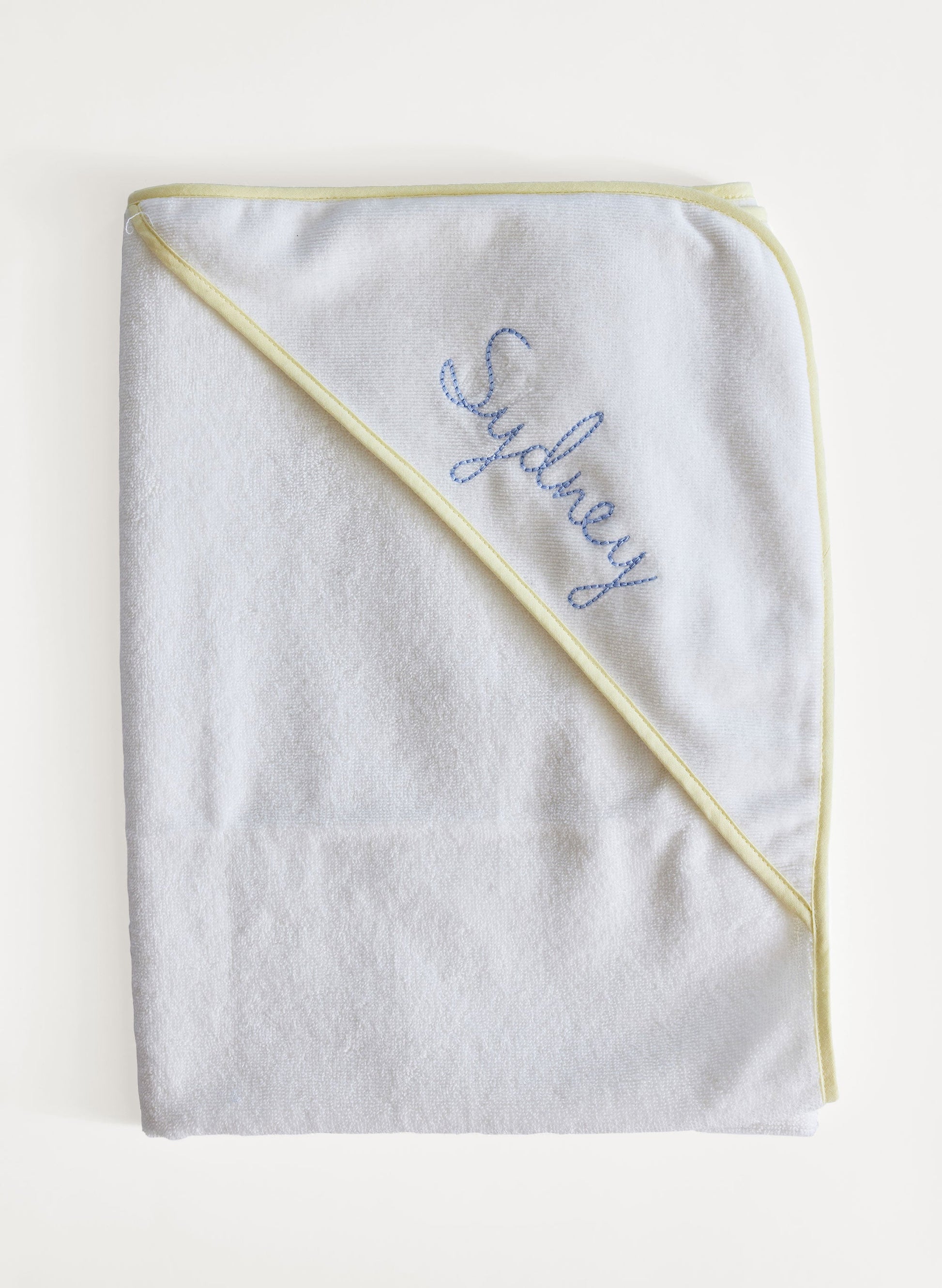 Only the softest for delicate newborn skin. Our sublime white cotton terry hooded bath towel and matching washcloth is perfect for babies, perfect as a baby gift. Make it even more special by personalizing it with a name or monogram. This set is finished with a lemon yellow binding.