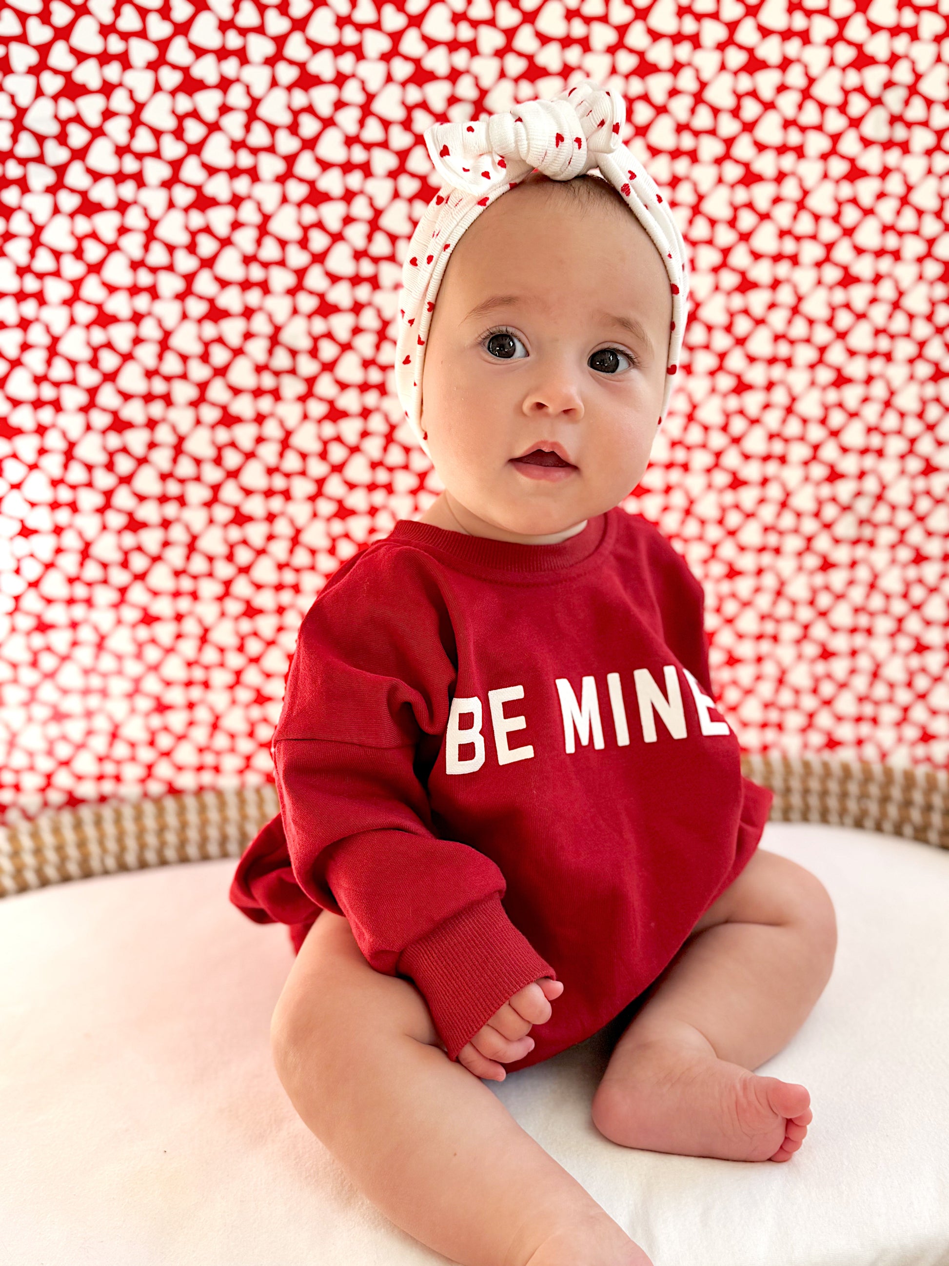 Be Mine graphic oversized sweatshirt romper with snaps at crotch. Lightweight terry material.