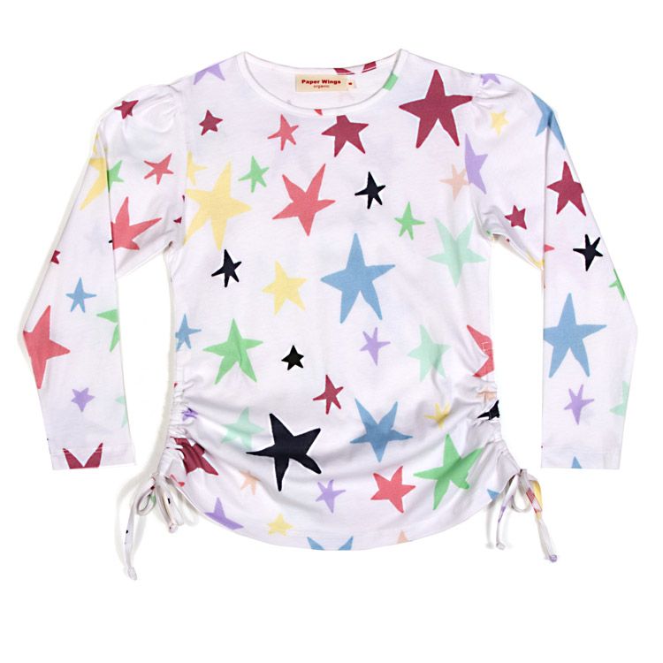 This classic long sleeve drawstring T-shirt has always been a favorite girls t-shirt design at Paper Wings and this colorful rainbow starry version is no exception.