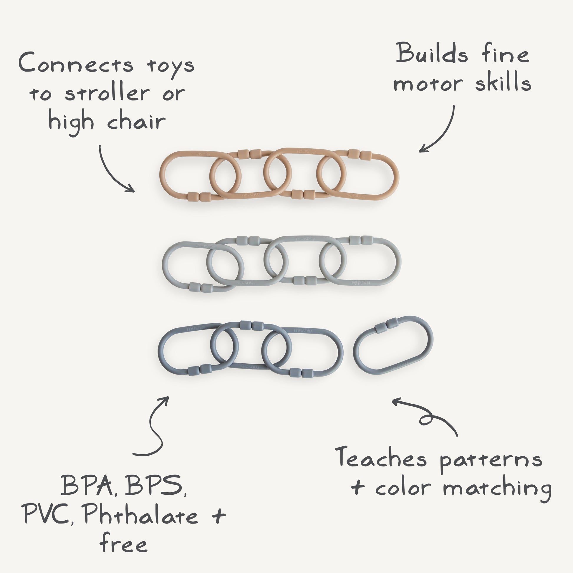 Keep toys within reach while engaging littles in a playful learning experience with our chain link rings. These durable, yet flexible plastic links can quickly attach toys to strollers and car seats, ensuring that favorite companions are always close by. Each set features three soft colors to help engage little ones and improve sorting skills. The minimal design and smooth, lightweight non-toxic material makes it easy for small hands to grasp and manipulate, enhancing fine motor skills.