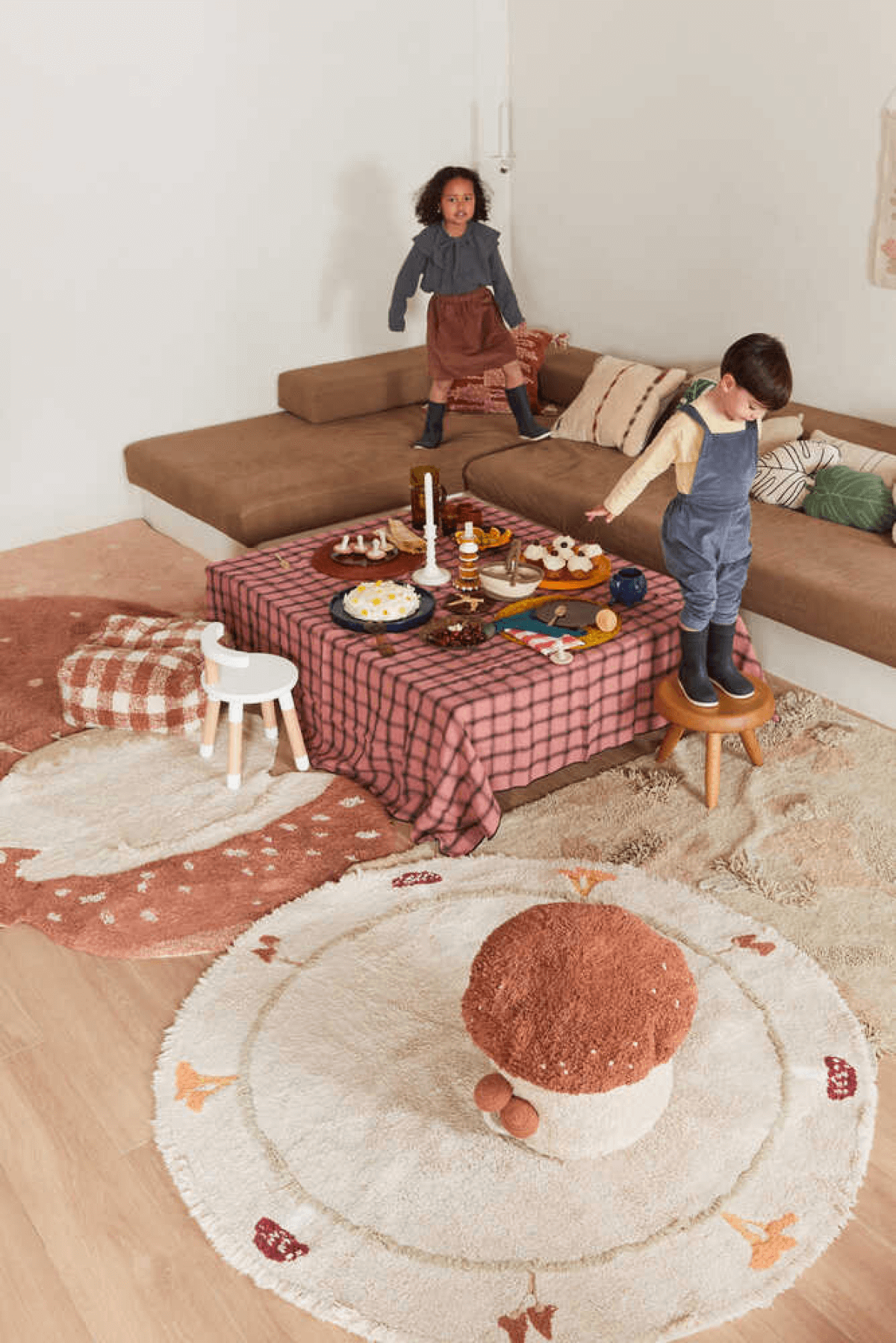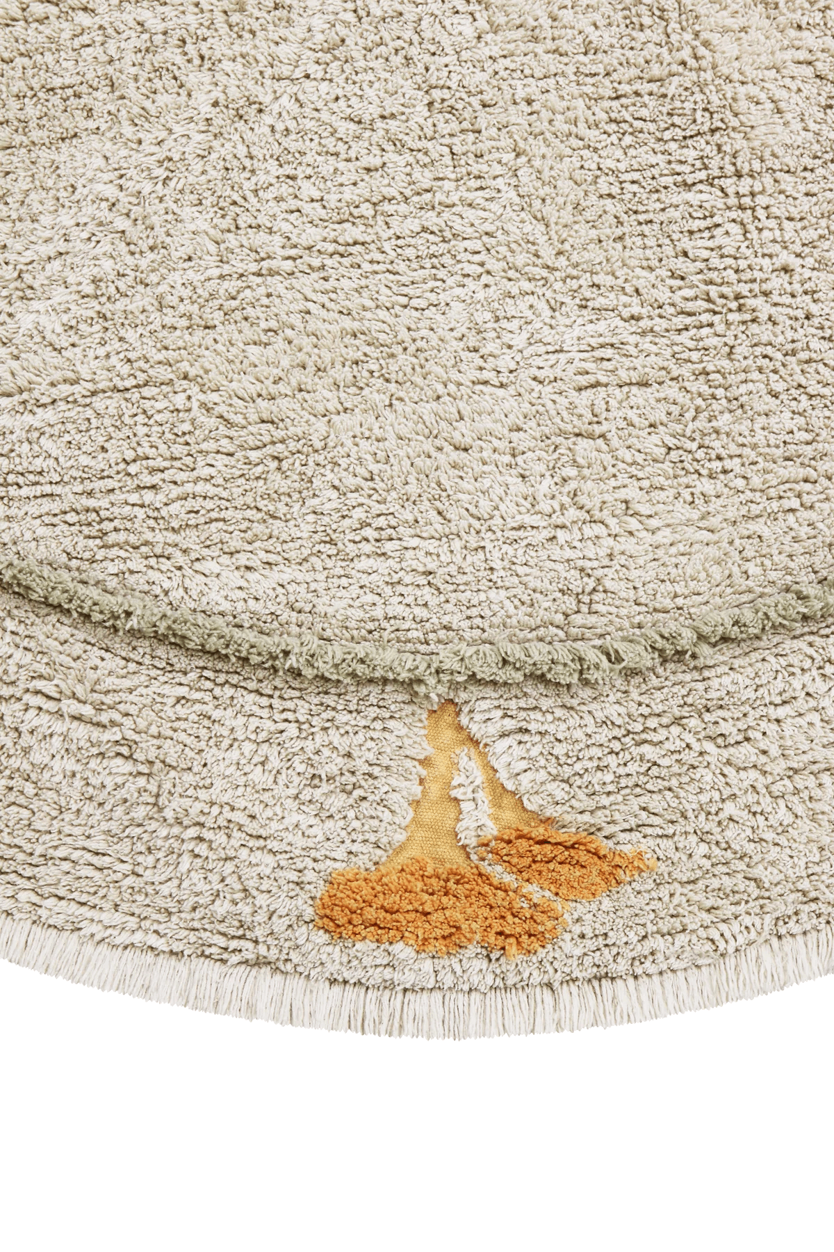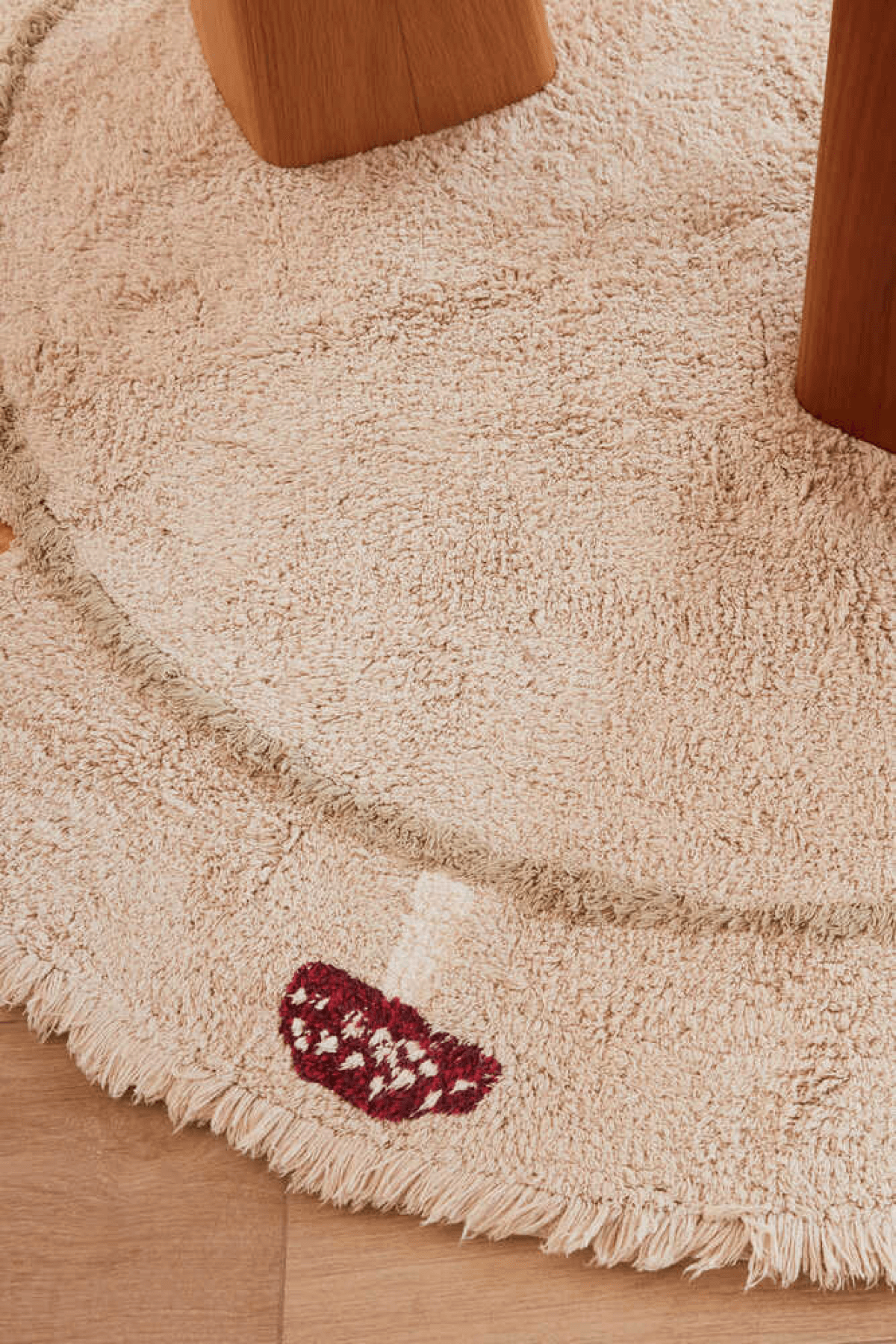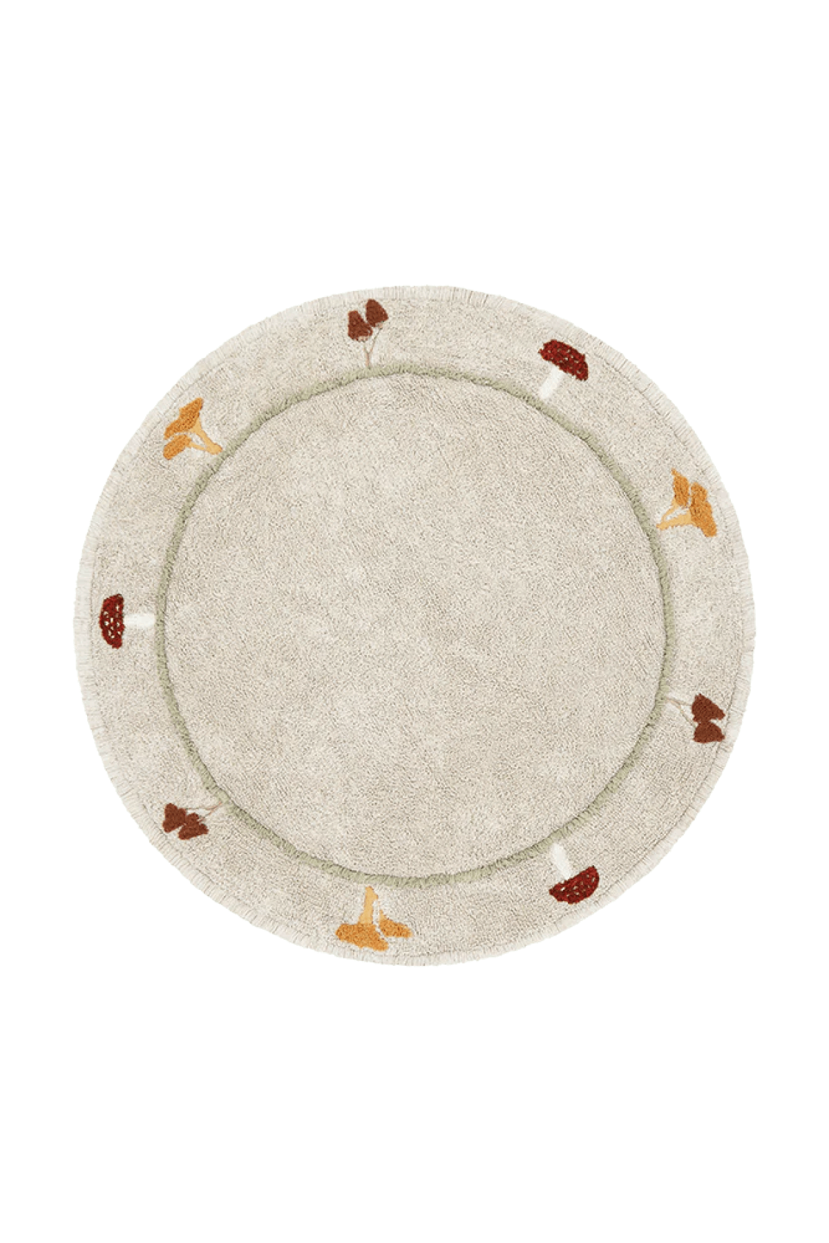 The round Chanterelle rug is the perfect addition to any room, as it blends seamlessly with any décor thanks to its natural color and shape. It's adorned with charming details, including a border featuring various mushroom species with different textures. The rug combines patches of canvas with tufted patterns, an inner circle with slightly longer Olive pile, and design elements in Honey, Burgundy, Toffee, and Ivory.