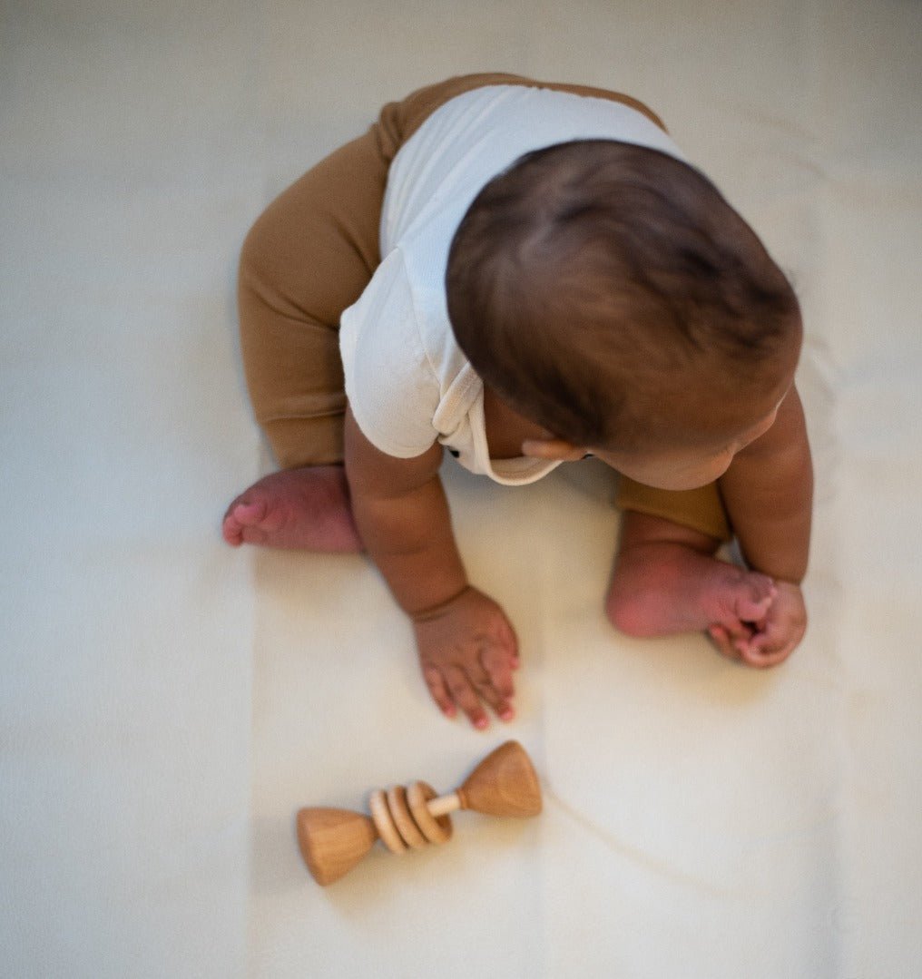 This beautiful classic baby rattle is organic, finished with a natural beeswax/flax seed oil finish. It is smooth, safe for babies, and makes a fun noise. As your baby plays, they develop their senses of touch, sight, and sound. Makes a fun and personal gift.