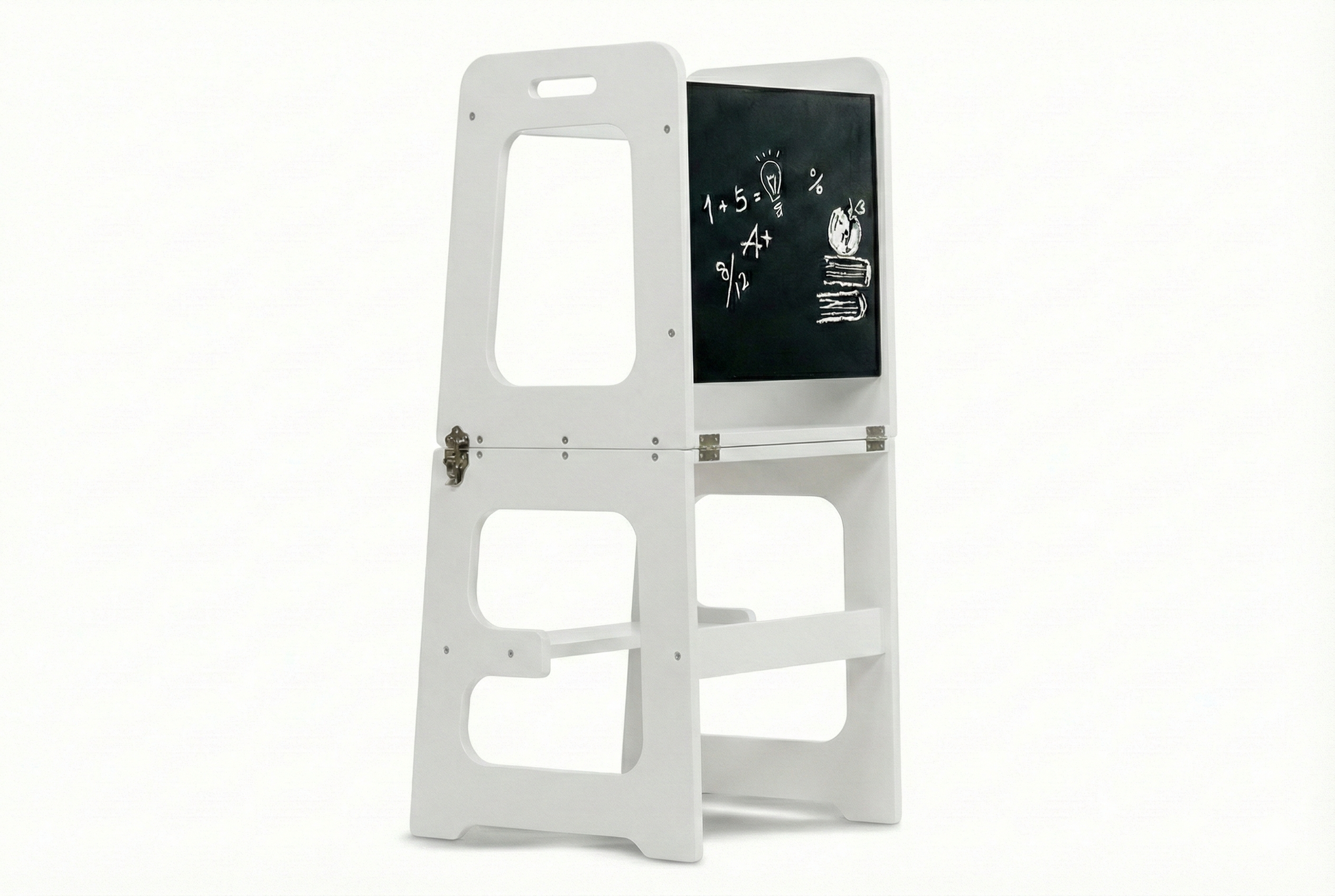 This 4-in-1 Montessori Kitchen Step Stool and Desk is every parent's dream! Elevate your toddler to helper status with its sturdy toddler kitchen stool design, perfect for cooking adventures and reaching the sink. Easily convert it into a desk for toddlers for creative play or learning sessions, and when it's time for artistic flair, it transforms into a chalkboard desk. Crafted from premium birch plywood, this convertible helper tower is built to last through endless moments of childhood exploration and discovery.