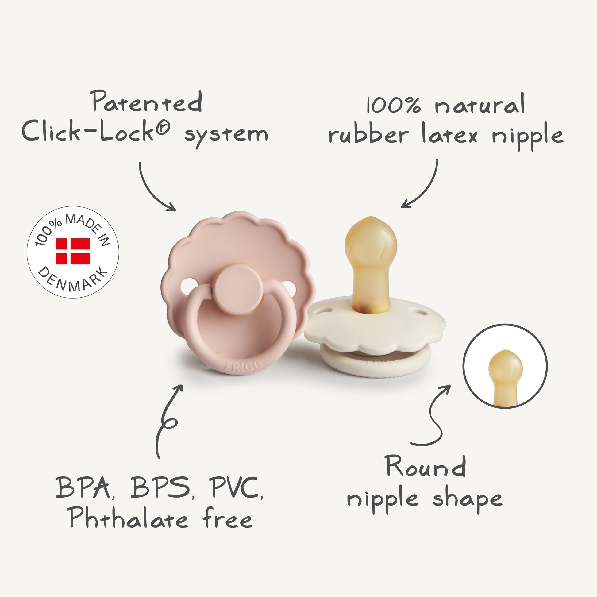 - What's included: 1 set of 2 Frigg Daisy natural rubber pacifiers