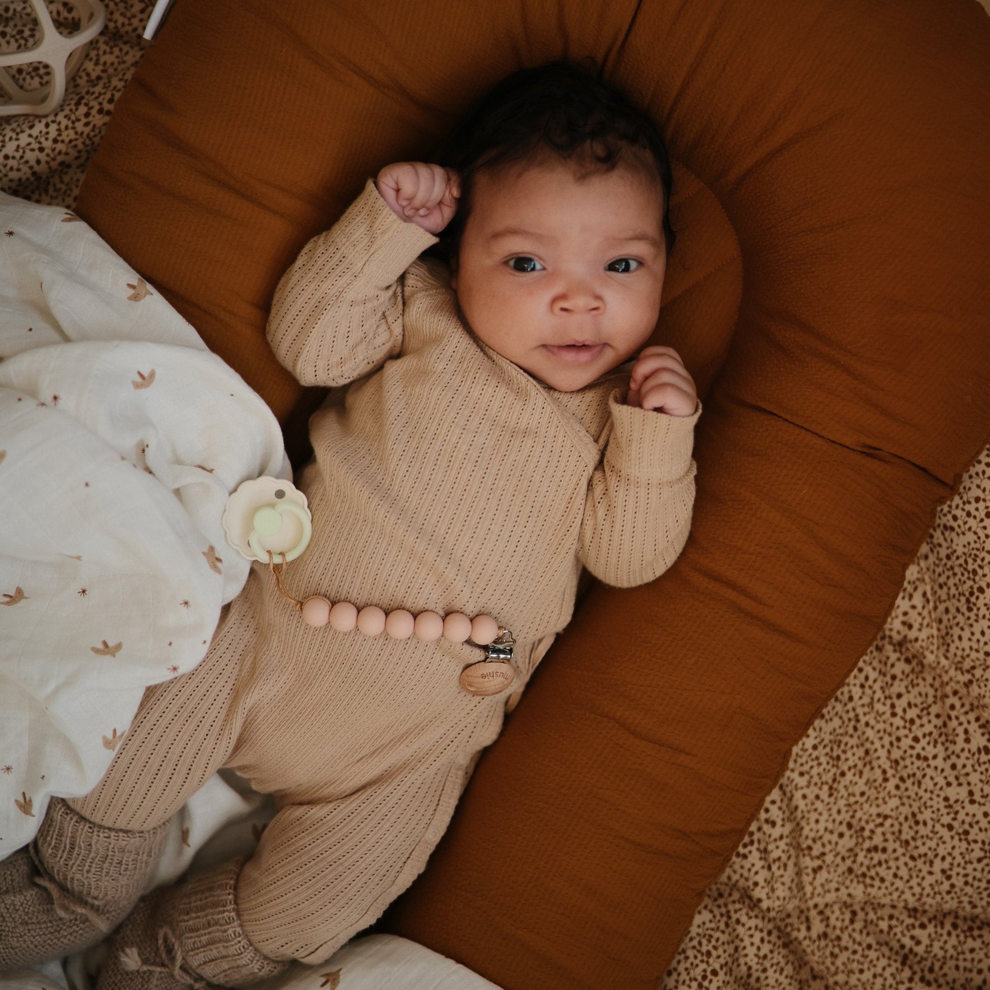 - Daisy Night pacifier ring and knob glow in the dark for easy visibility at night.