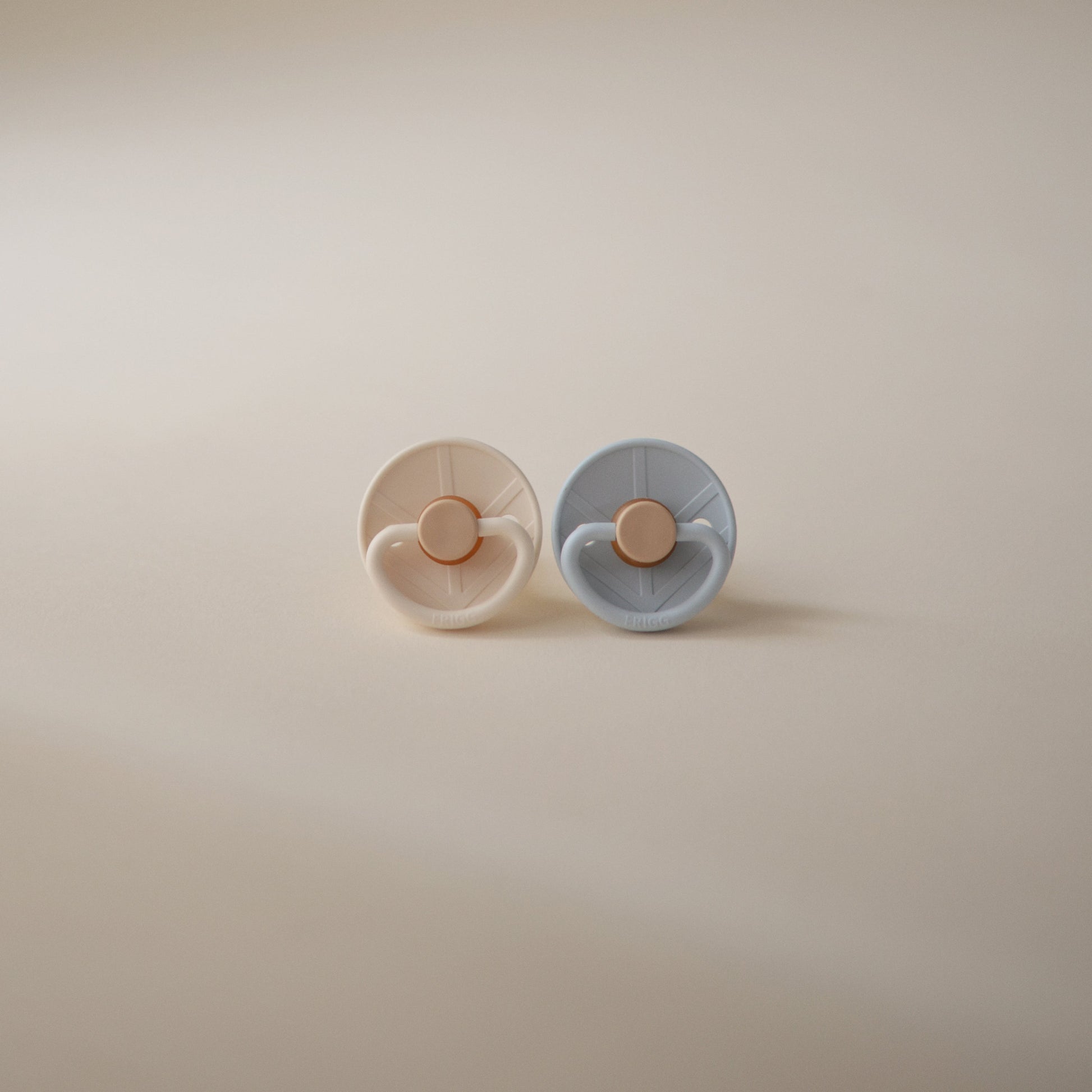 The FRIGG line of Little Viking silicone pacifiers is inspired by Norse mythology, including the Norse Goddess Frigg who is the inspiration behind the FRIGG brand. FRIGG's silicone pacifiers feature an improved SilkySoft™ nipple and innovative Click-lock System. The outward curve keeps the pacifier off their delicate skin, while features like air holes and a security handle ensure your baby stays safe. Available in a range of soft colors, FRIGG pacifiers make a beautiful addition to your collection of baby essentials.
