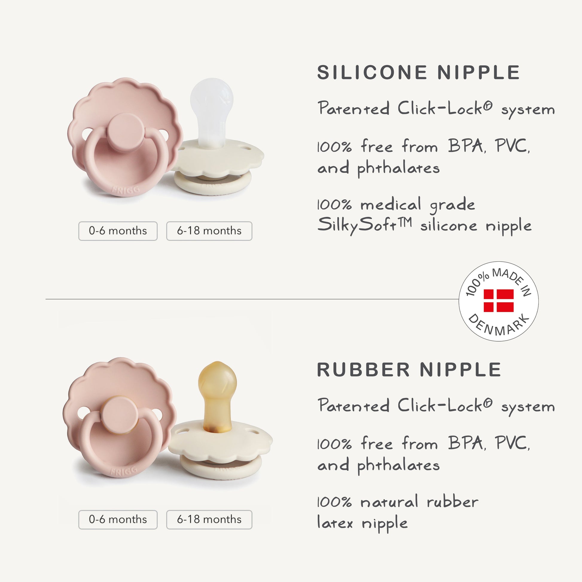 - Pacifier nipples are made with natural rubber and may expand with use