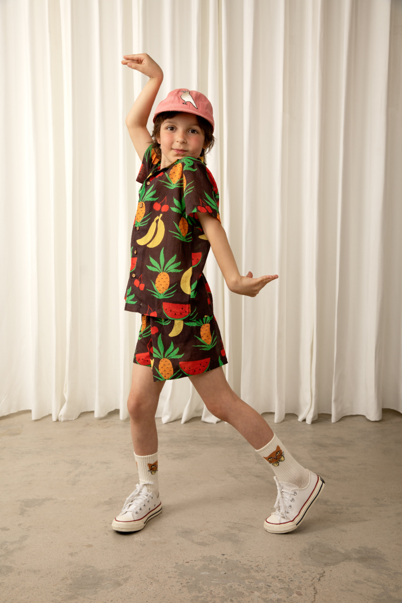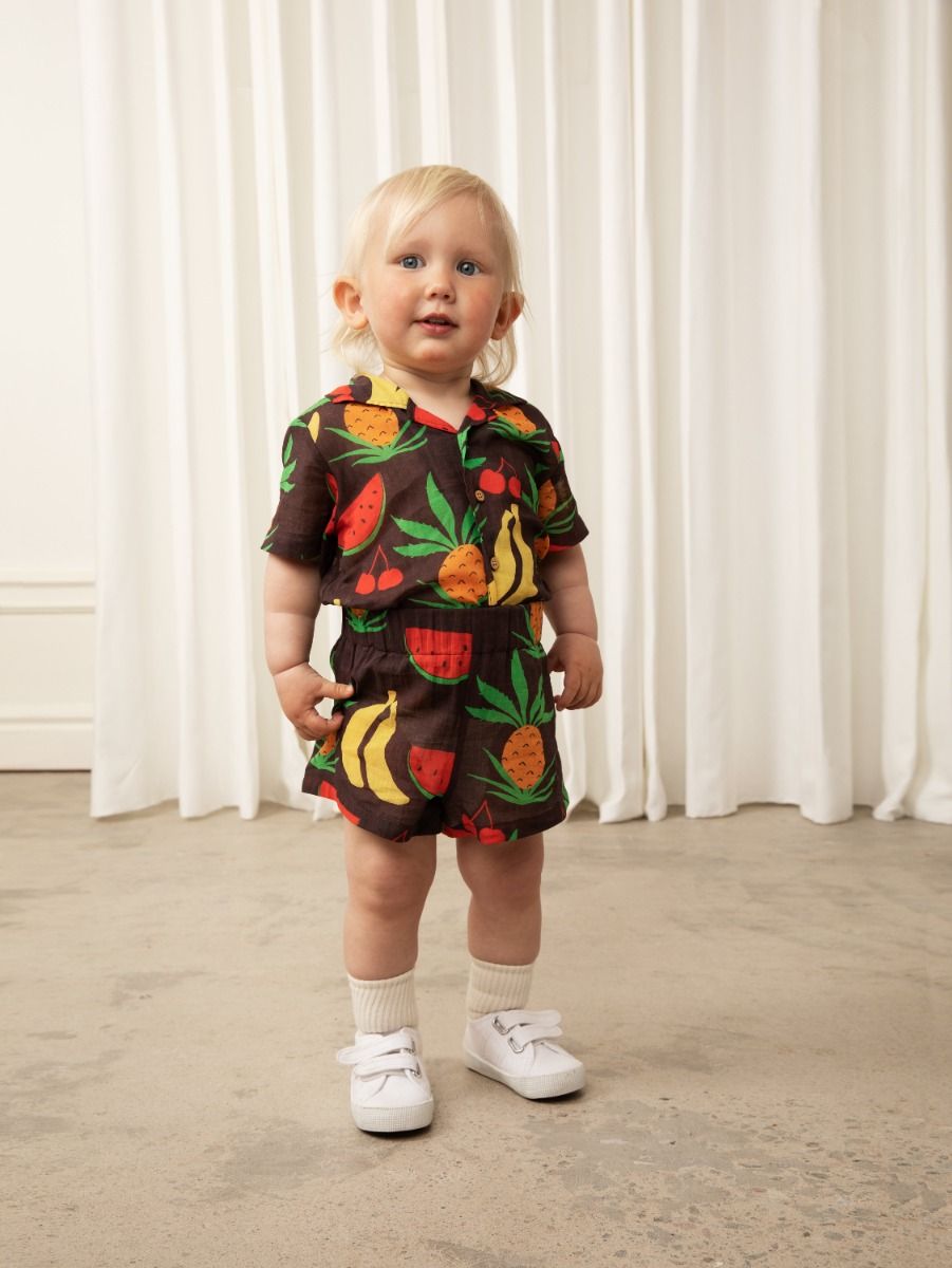 Brown woven shorts with all over Fruits print, made from 100 % GOTS certified organic cotton. The shorts are made with an elastic waist with a drawstring on the inside. Perfect for warm summer days.
