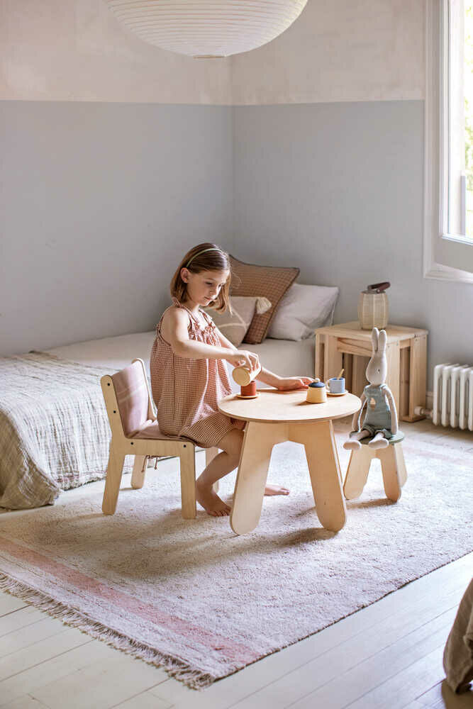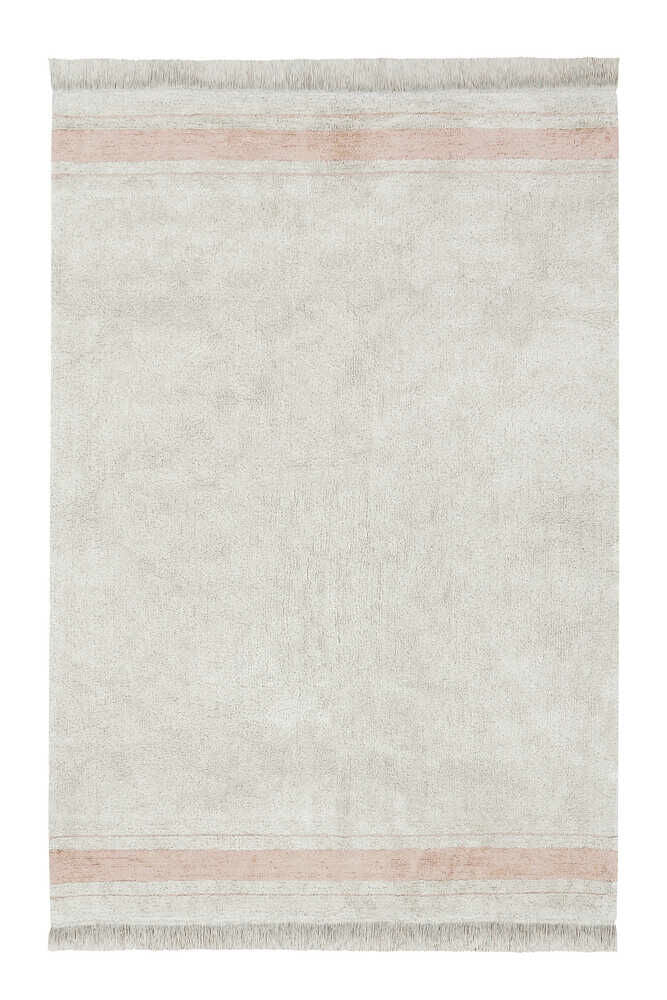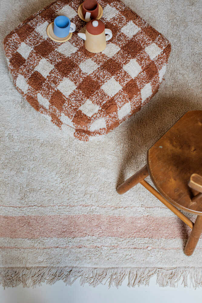 Inspired by the traditionally woven kitchen linen with stripes and checks, this rug is made using our blended RugCycled canvas base, with soft tufted cotton pile on top in natural undyed color and 3 stripes in Rose, in short pile at the border. Finished with short fringes at the edge.