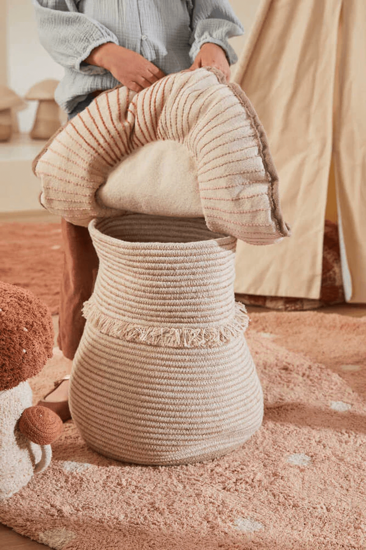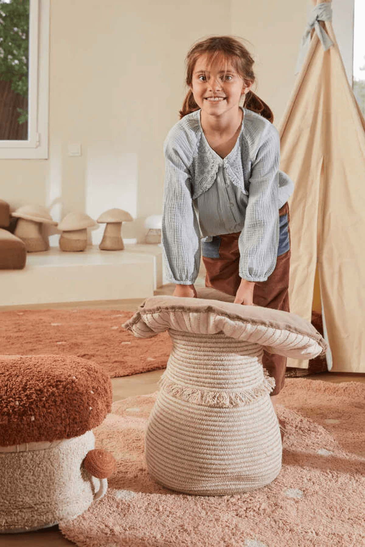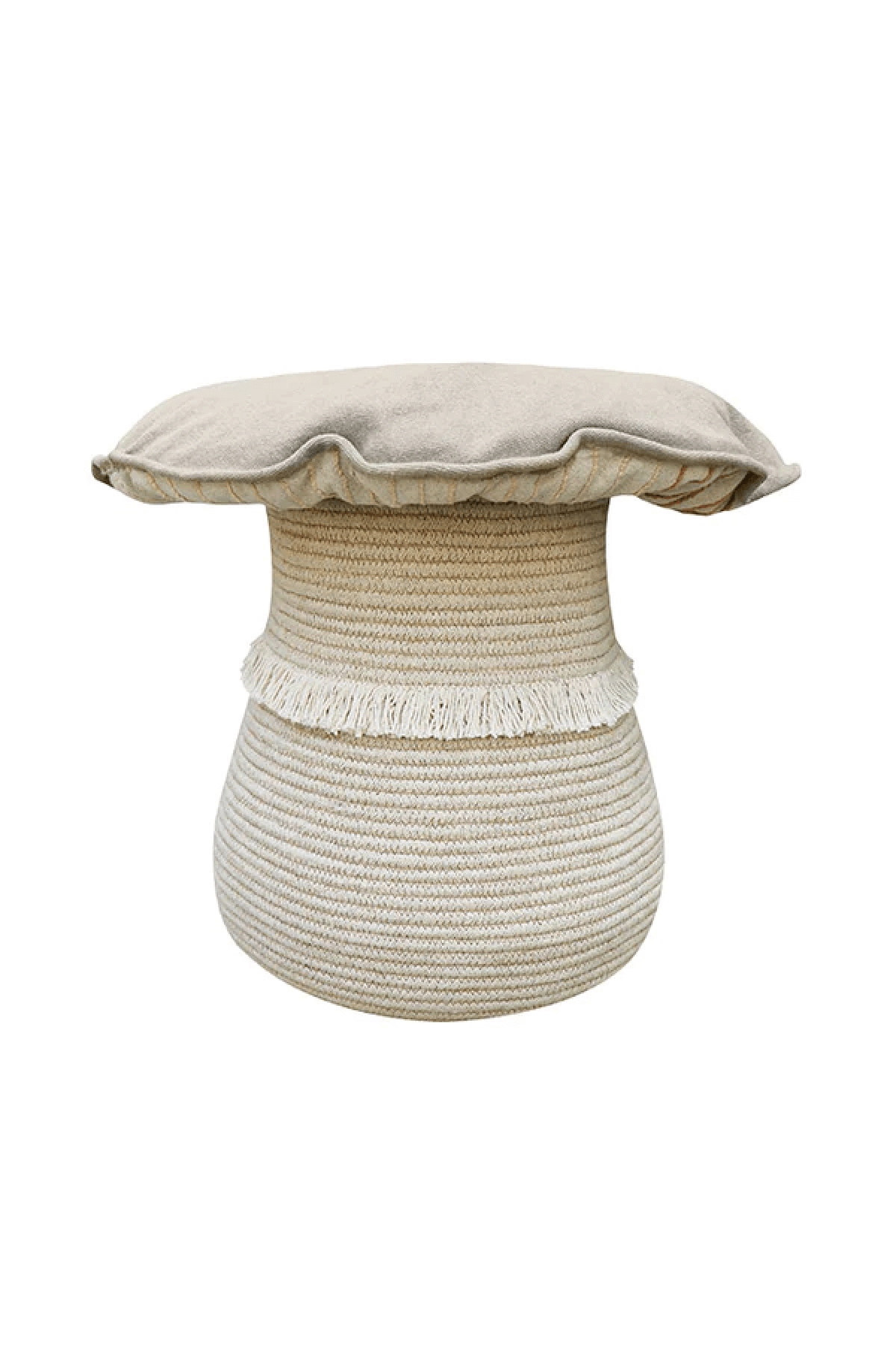 A decorative solution 2 in 1. A giant Russula mushroom consisting of a practical spacious storage basket, and a soft cushion as a top cover. The basket, slightly curved, is made of braided ropes, using yarns from recycled PET-bottles combined with cotton, featuring decorative fringes. The top part of the mushroom is a soft cotton canvas cushion in Natural and light brown, with decorative embroidery stitches, simulating the "hat" of a mushroom.