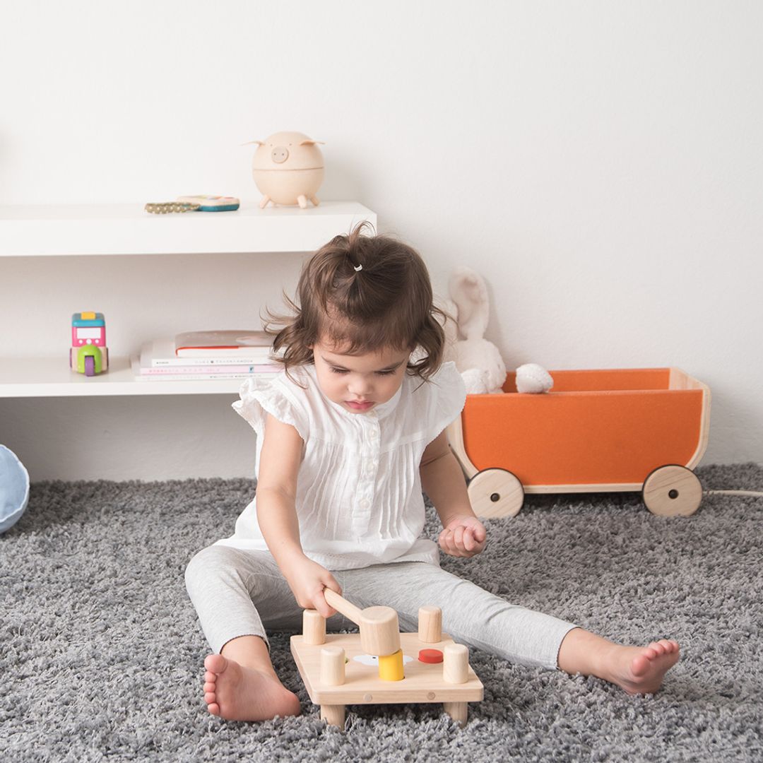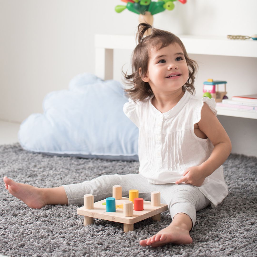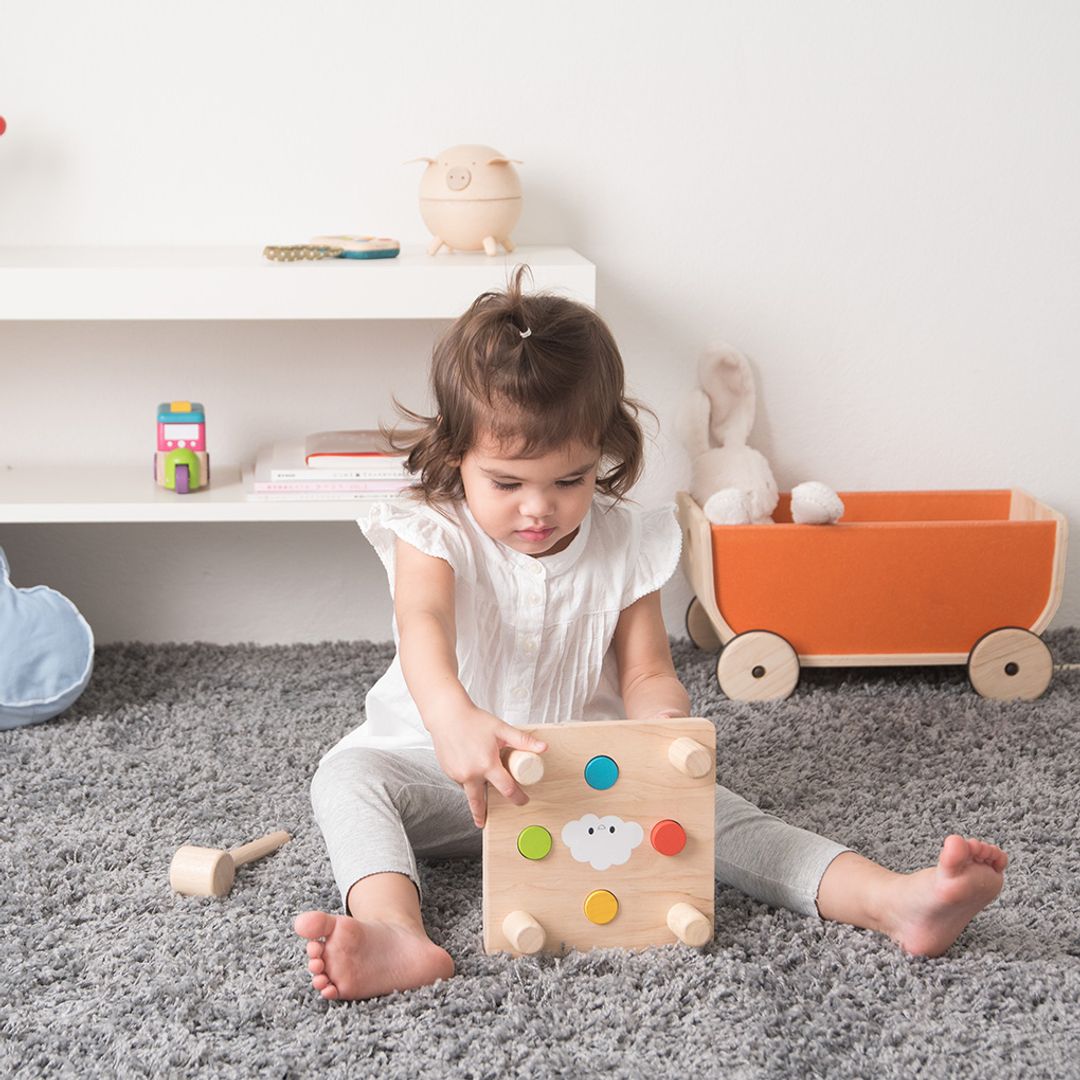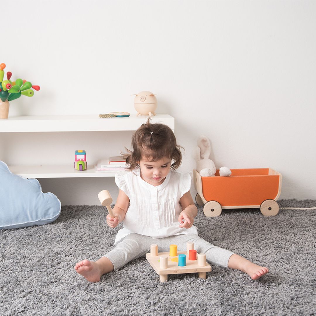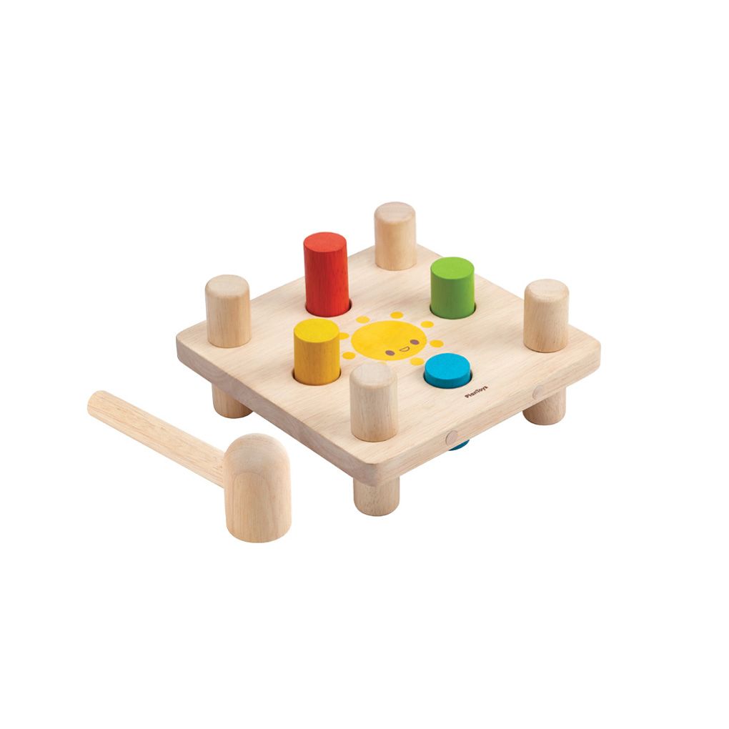 The Hammer Peg includes a four-hole wooden board with a wooden mallet for hammering practice. Children can turn it over and start the fun all over again.