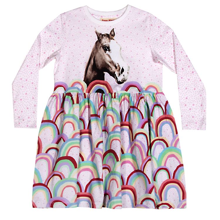 The gathered waistline of this girls dress is both flattering and practical and combined with the the the stars, colourful rainbows and happy horse portrait print this makes this dress a comfy and fun choice.