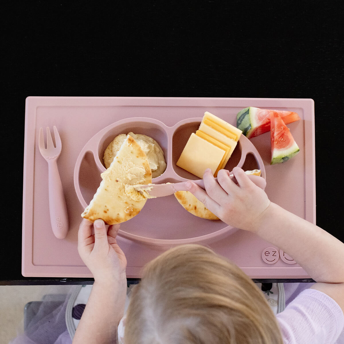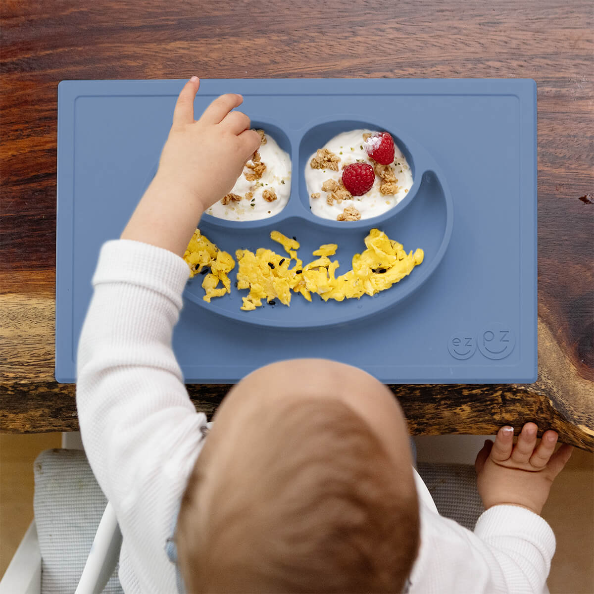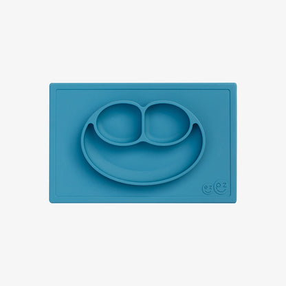The Happy Mat is ezpz's award-winning flagship product. It is an all-in-one placemat + plate that suctions to the table, which means that it captures the mess and reduces tipped bowls and plates.