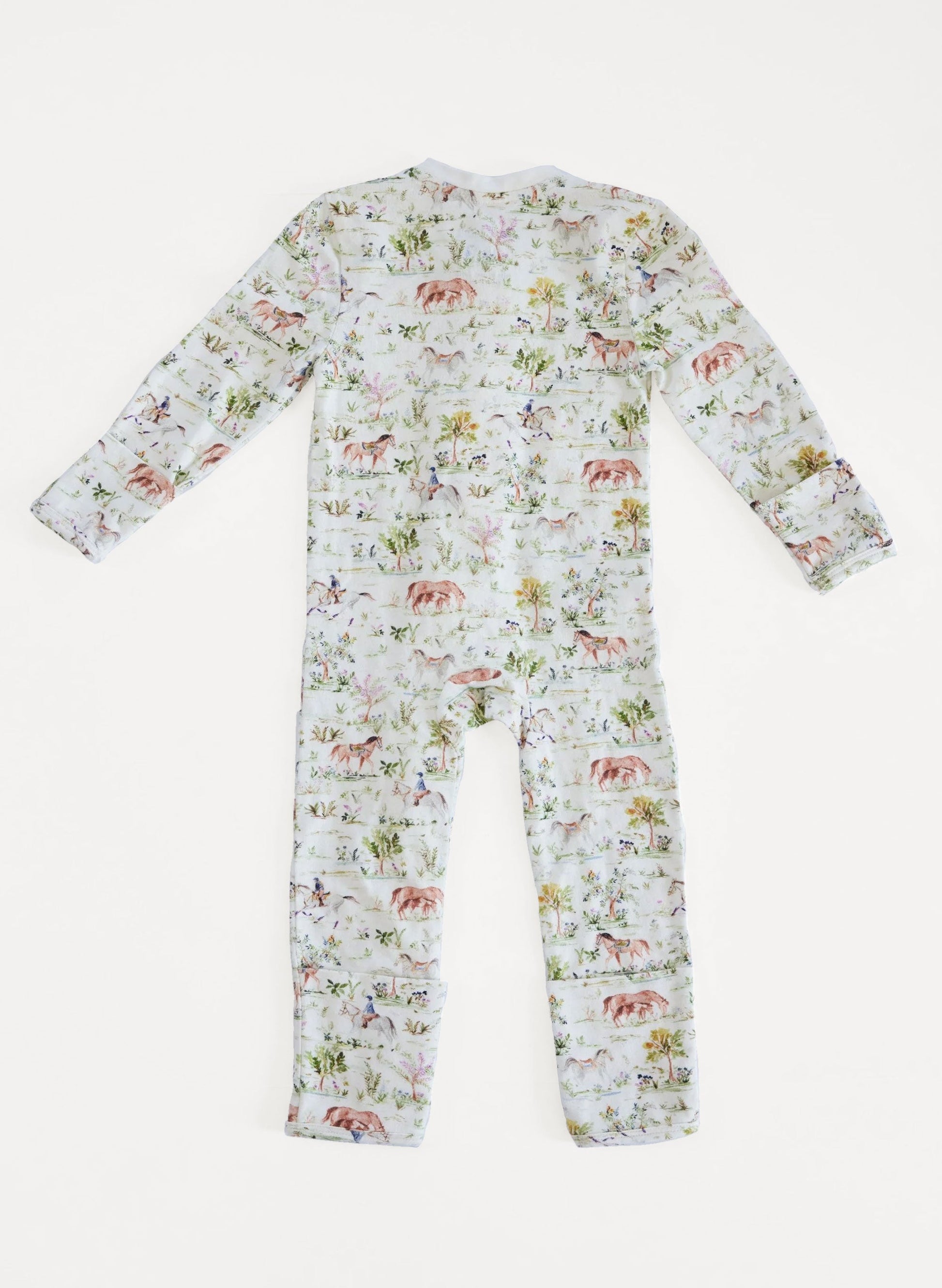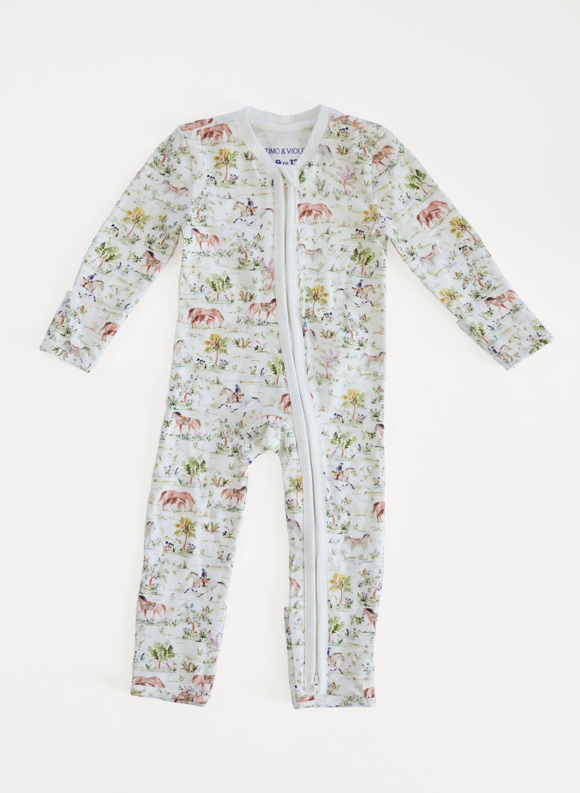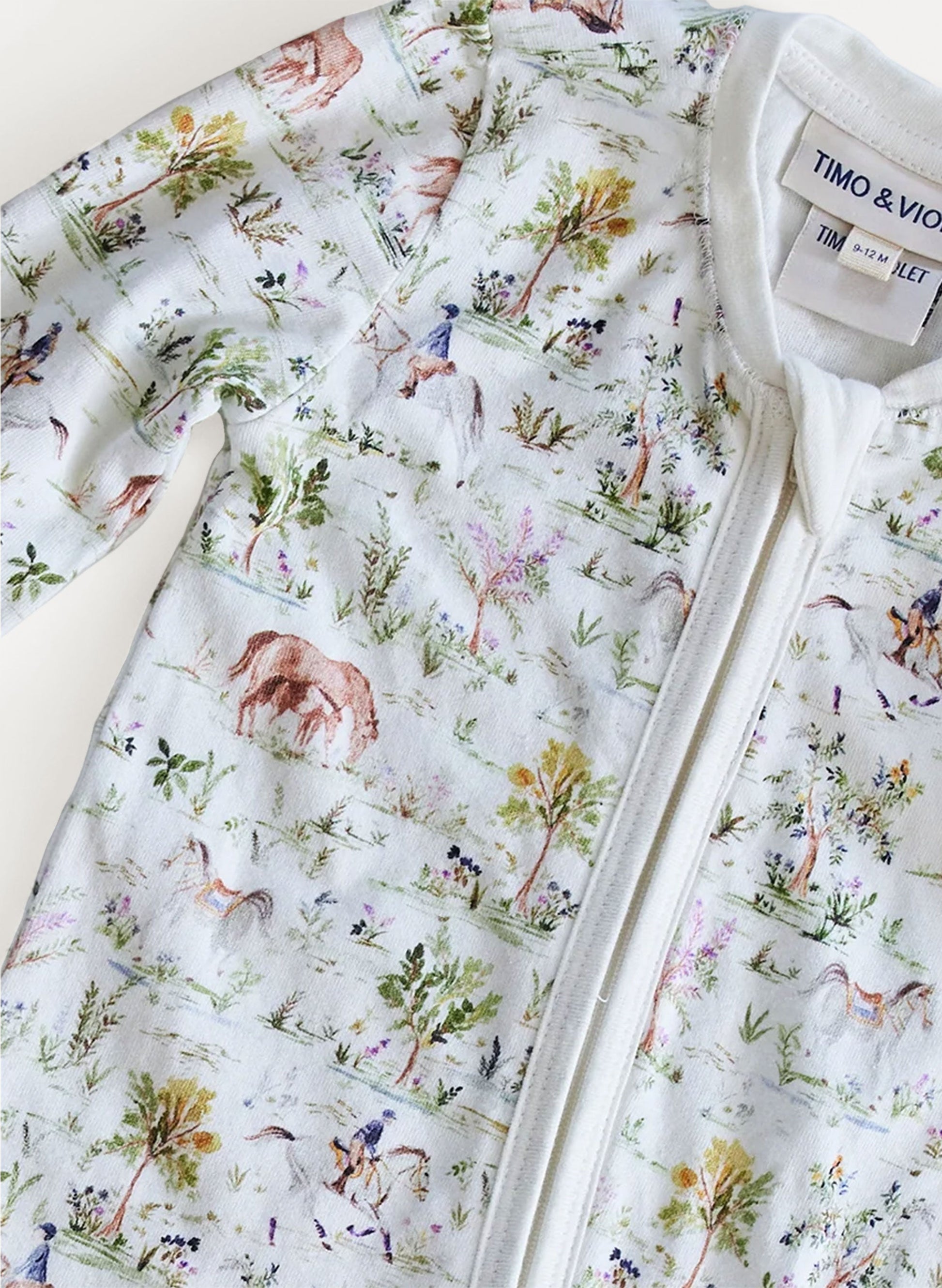 The perfect one-piece in the Hunter Pace horse design. With fold-over hand mittens (for sizes up to 9-12 months) no scratches, fold-over foot cuffs for versatility, and a double zipper for easy diaper changes.