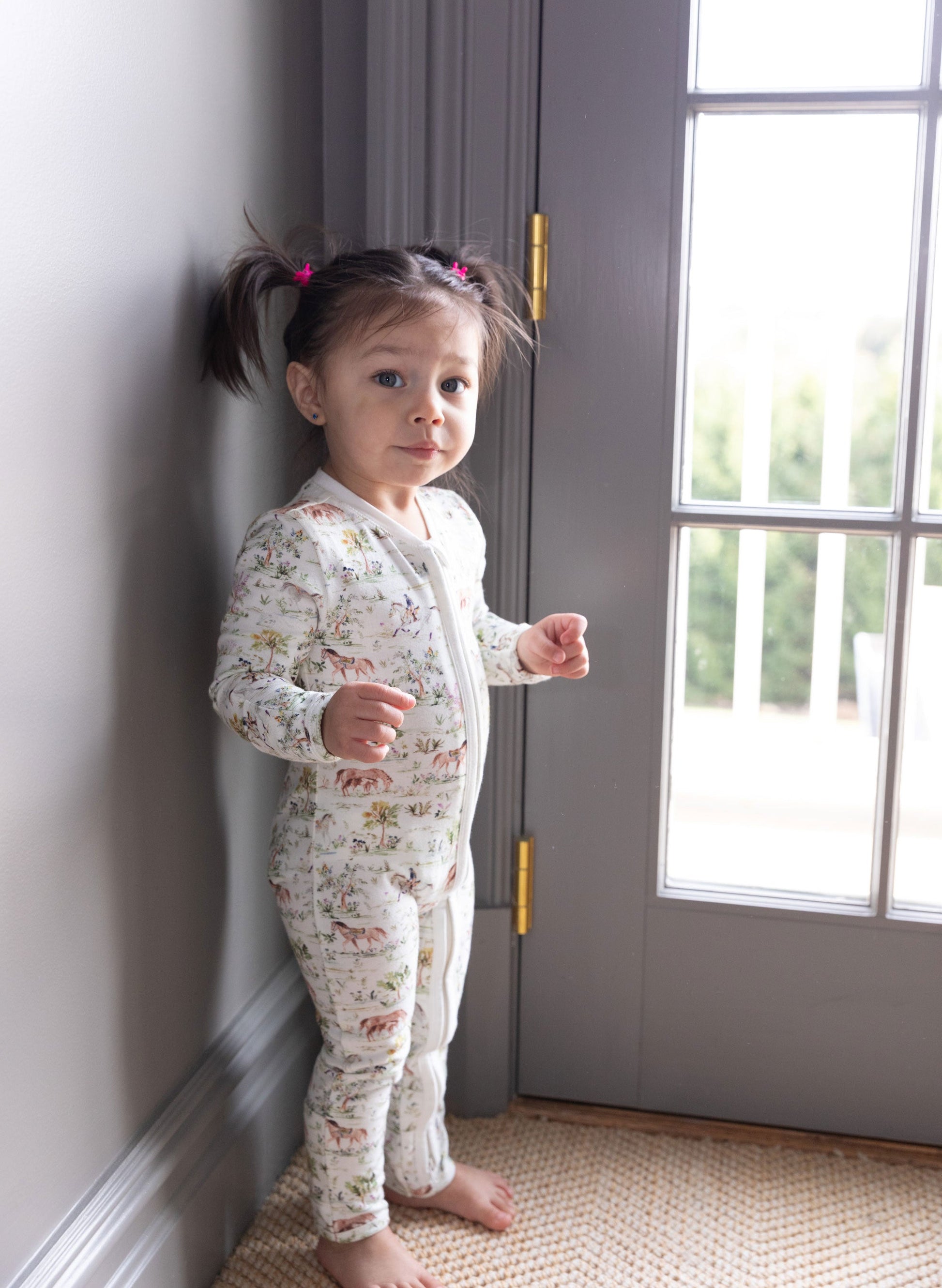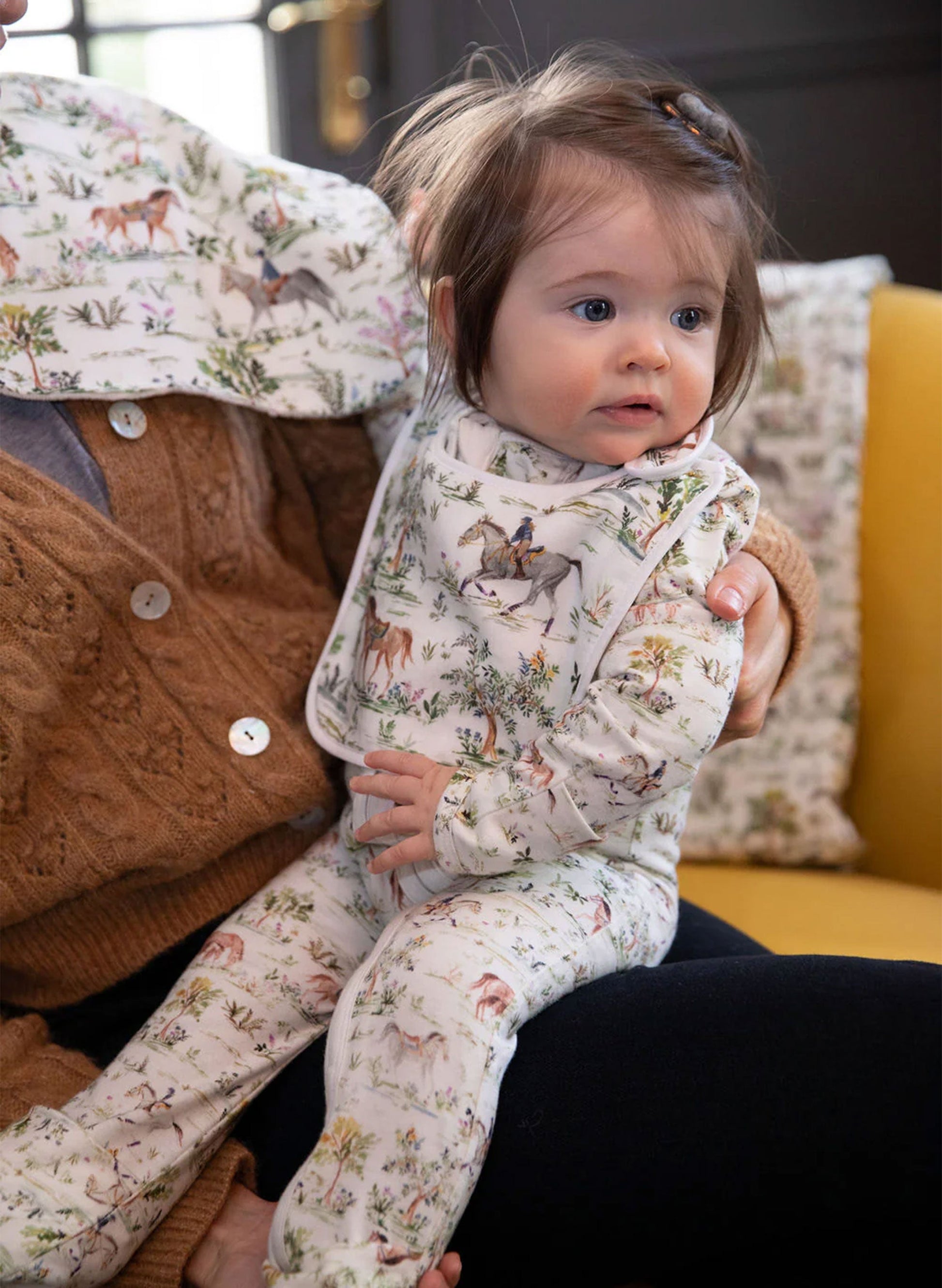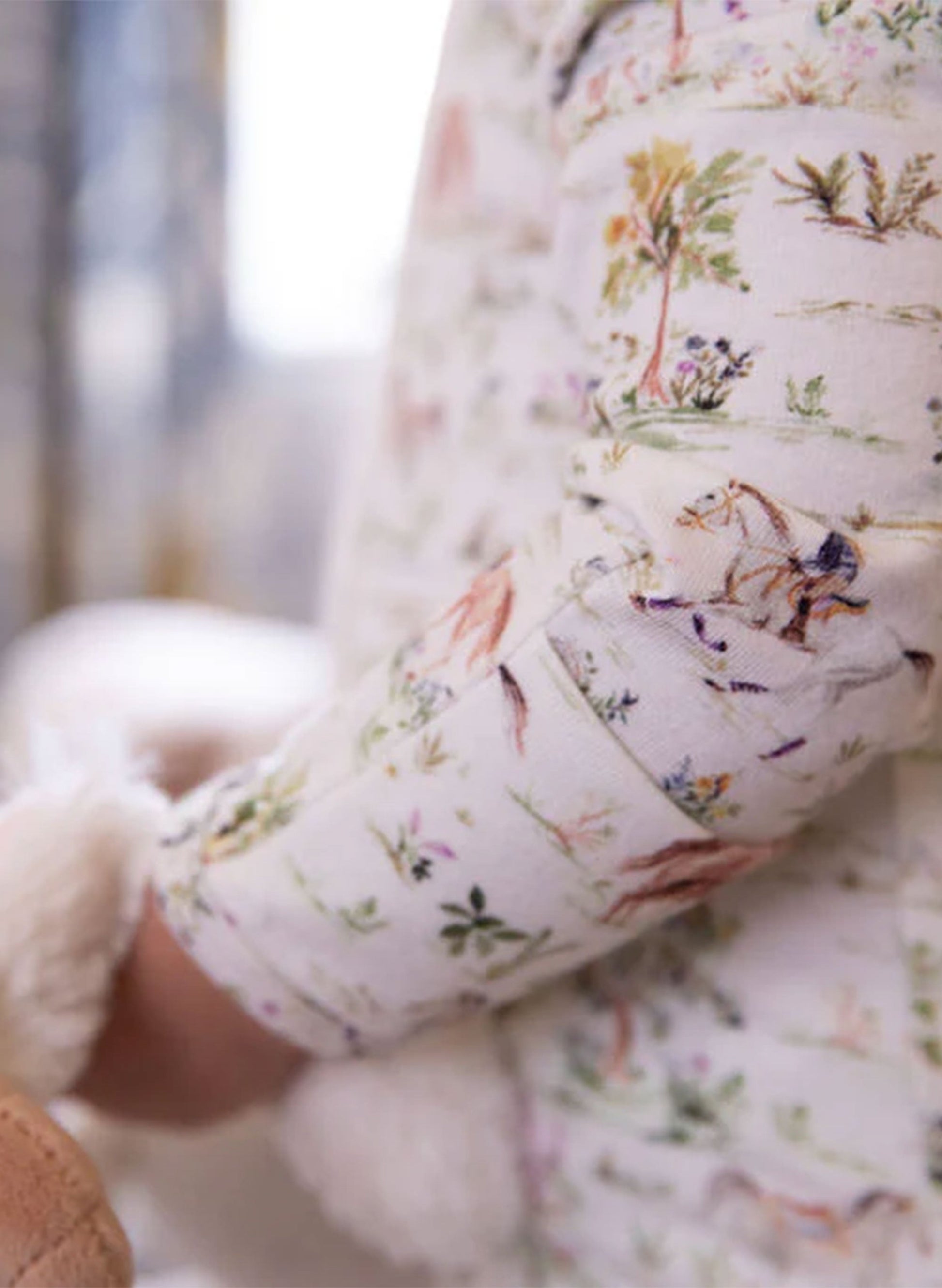 The perfect one-piece in the Hunter Pace horse design. With fold-over hand mittens (for sizes up to 9-12 months) no scratches, fold-over foot cuffs for versatility, and a double zipper for easy diaper changes.