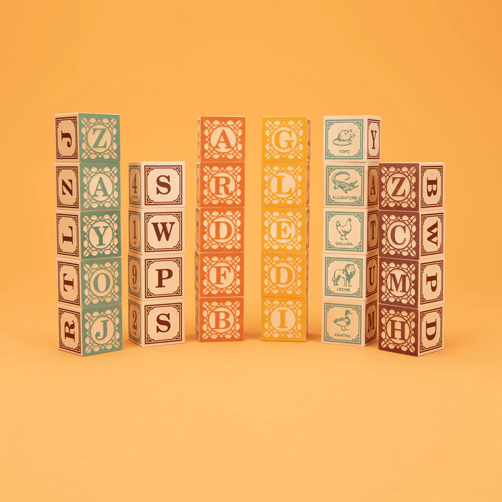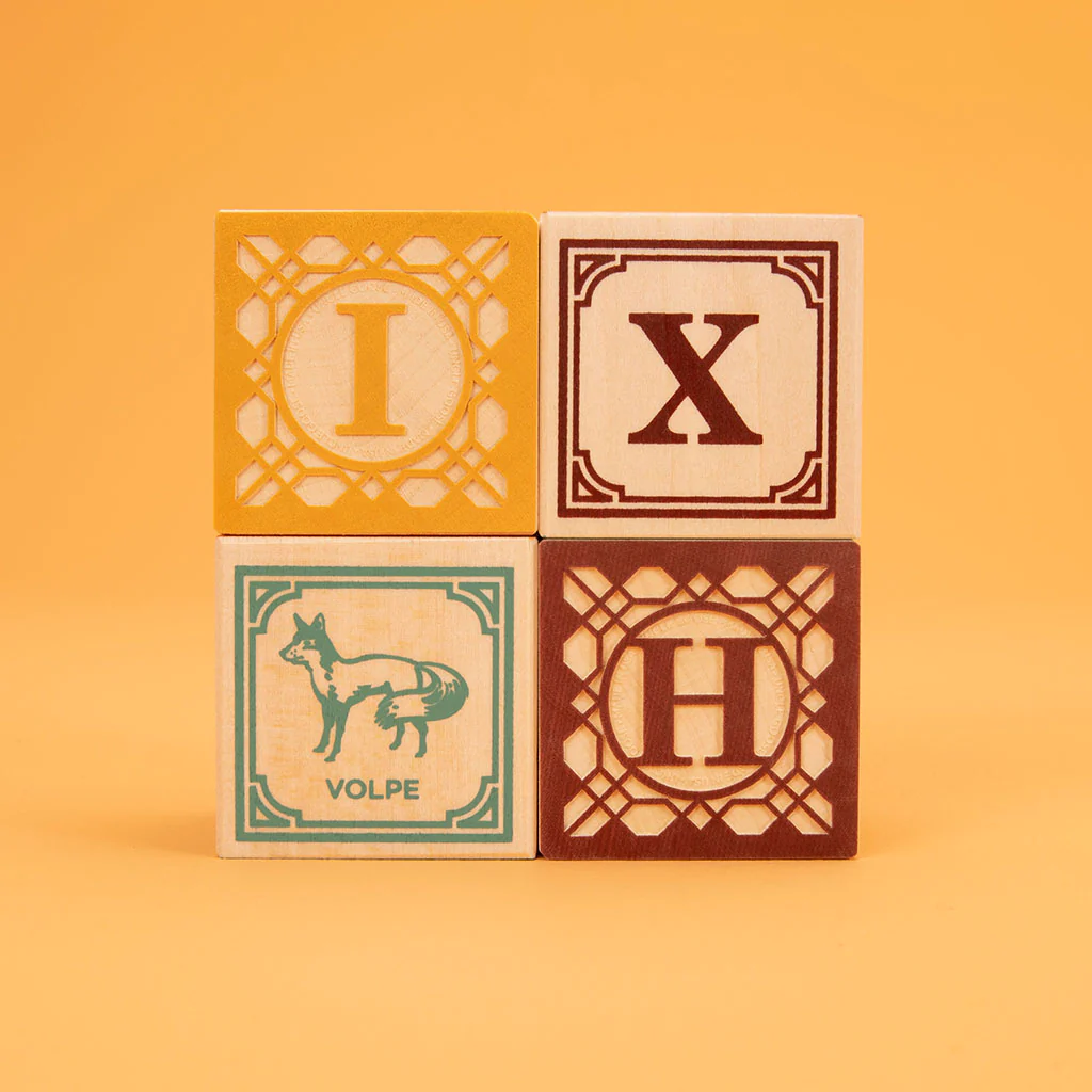 Expand your knowledge of Italy and the Italian language. Enjoy the embossed Italian design that surrounds two letters on each block. Two other sides reveal one number and one animal paired with their Italian translations. Two more capital letters make for four complete alphabets in this hand crafted set.