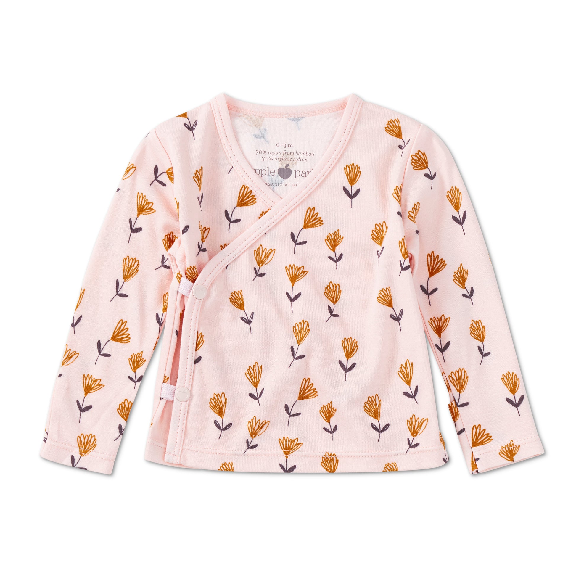 - Long-sleeve kimono style with inner tie and hidden snaps for easy dressing