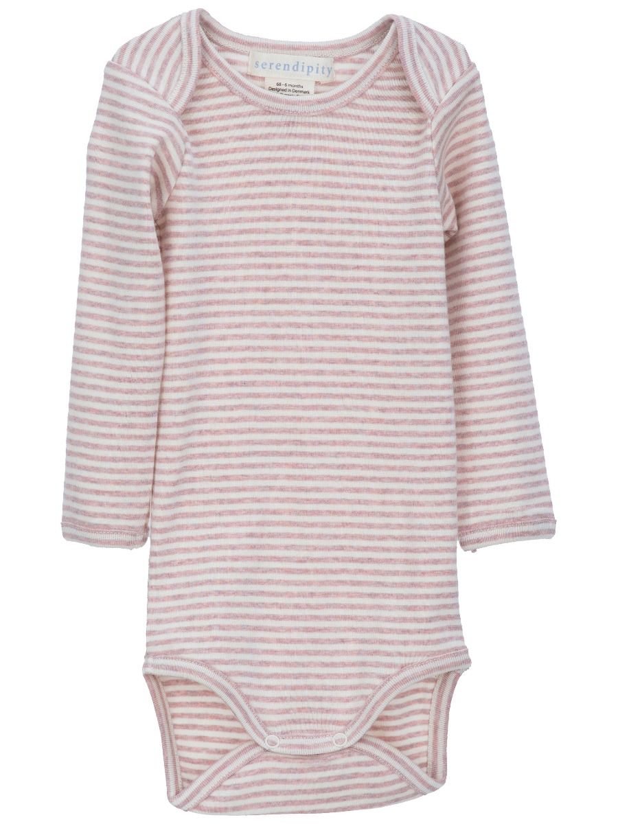 Powder rose baby body with thin off-white stripes. Practical envelope neck for easy dressing, and push buttons between the legs.