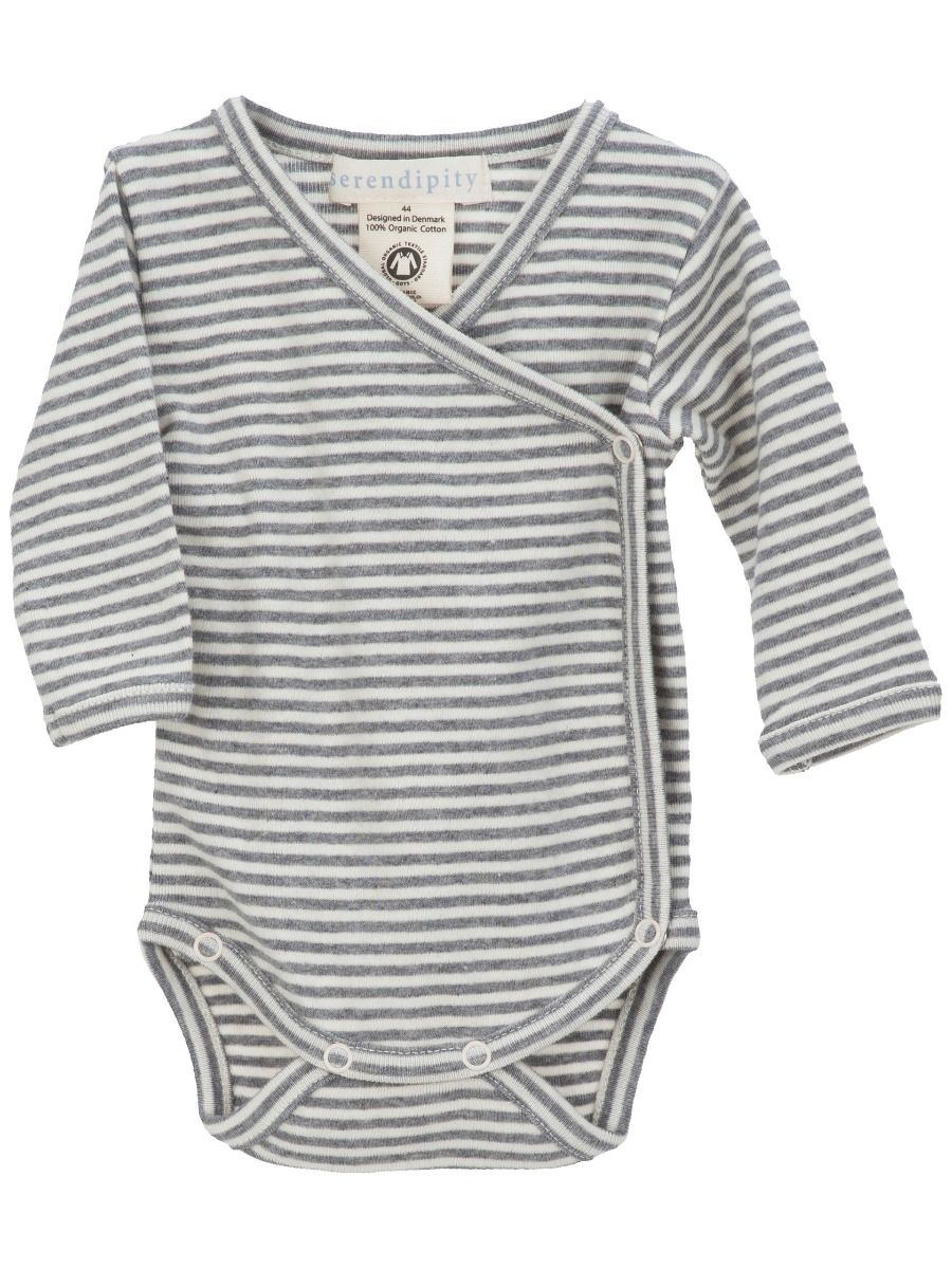 Grey stripe baby body with full wrap opening in front for new-born and premature babies. Push buttons and long sleeves. Additional small opening in size 44 for tube on left side.