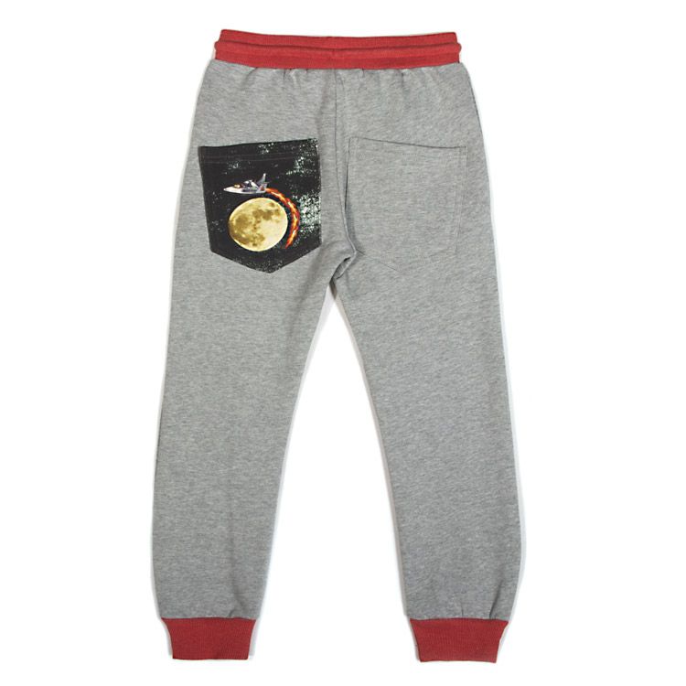Paper Wings classic trackies in grey marle organic cotton loop back fleece offer a great fit and plenty of cool with the contrast printed back pocket and contrast bands.