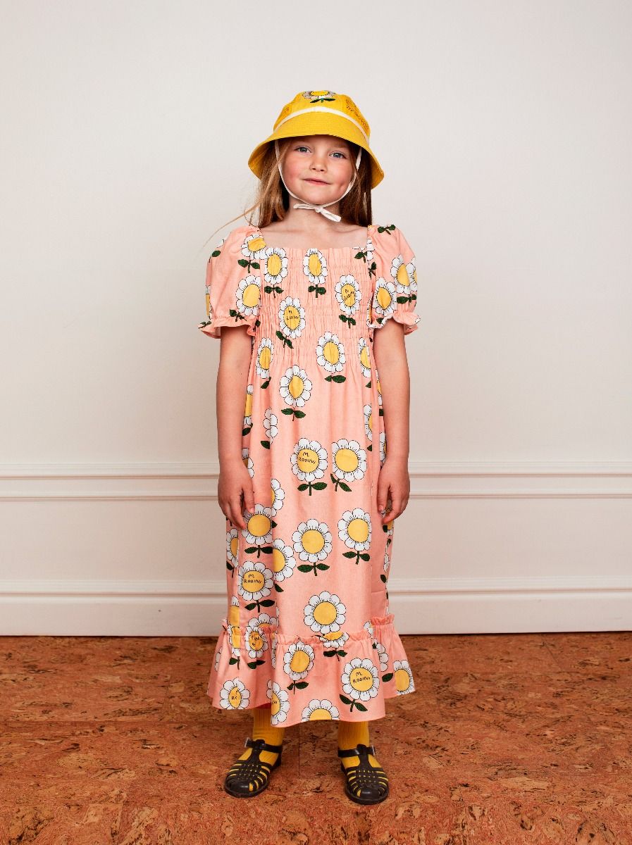 Light woven dress covered in a garden of the M.Rodini Flower print, made from 100 % GOTS certified organic cotton. Designed with puffed sleeves, elastic smock around the chest and a lovely long skirt with frilled hem.