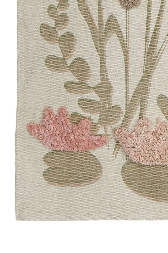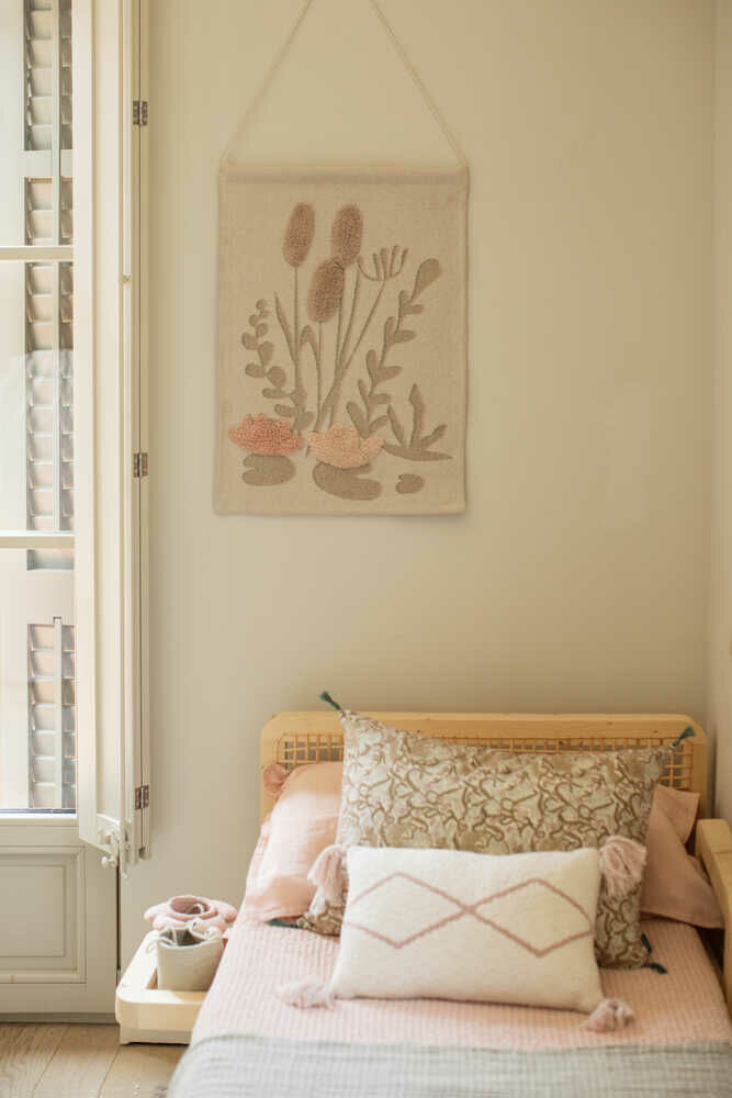 A reflection in the water printed on cotton canvas. As a cut-out of our magic pond, this decorative wall hanger depicts water lilies and cattails that seem to want to pop out of the canvas. Combine it with other items from our Fantasy Garden collection and turn the kids' room into a magic pond.