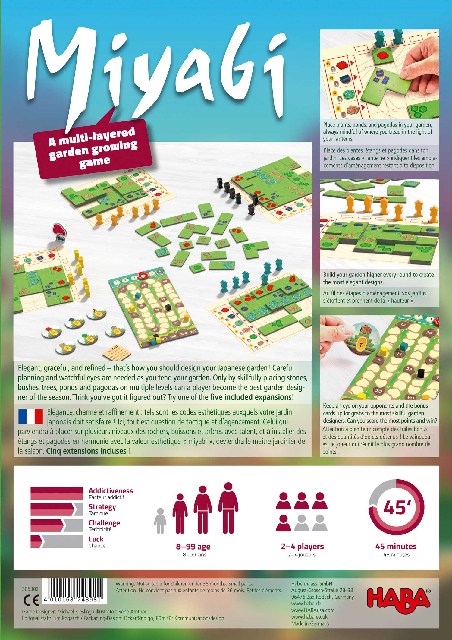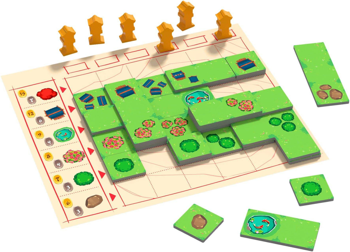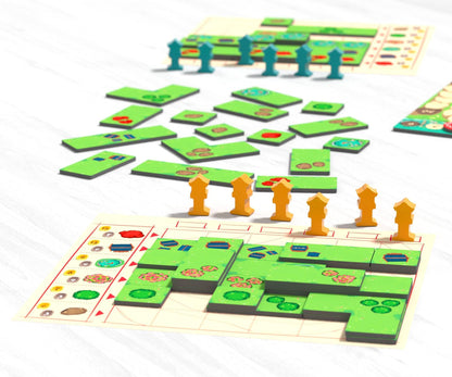 As the game progresses, you can also build upwards, placing garden tiles on top of other garden tiles. Receive points during the game for your placed garden tiles, scoring more points the higher the layer, with a bonus for the fifth layer. At the end of the game players receive extra points for having the most objects in their gardens. The highest score wins!