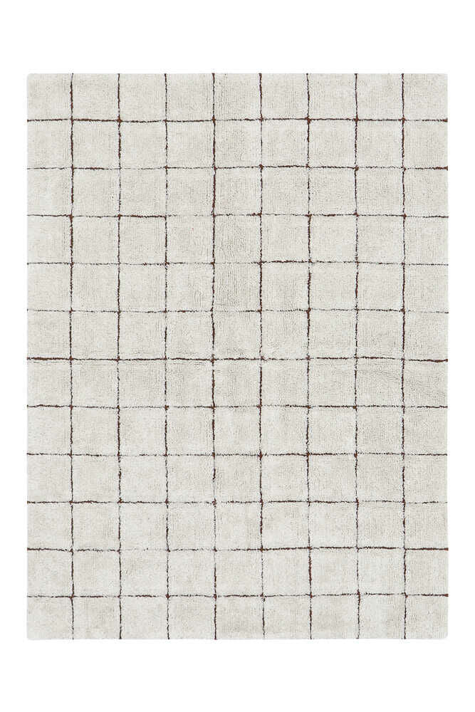 Inspired by traditional vintage ceramic floors, the Mosaic rug features a checkered pattern in natural color on top of a Toffee color canvas base slightly showing through in between the squares, simulating the tiles of a kitchen floor.