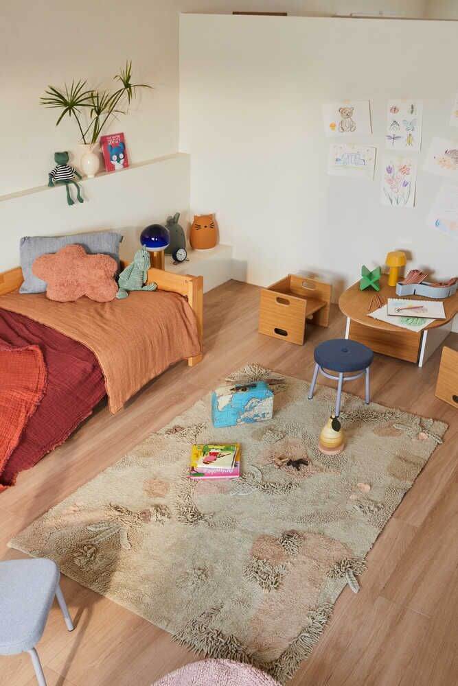 A rectangular play rug inspired by an autumn forest full of moss, lava and ferns, where the mushrooms peek out from under the fallen leaves. Delicate handmade details in canvas and chenille in autumnal colors such as Olive green, Honey, and golden brown tones give this rug an original texture. Comes with a cute little cotton basket and 9 handmade chanterelles to play with.