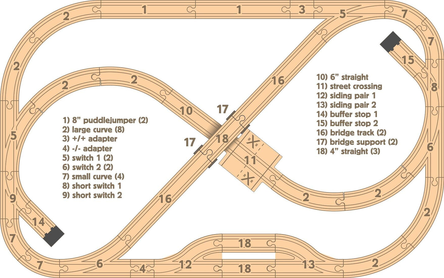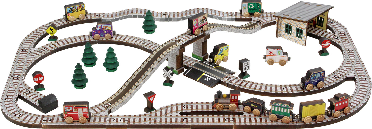 Beep beep! Toot toot! Chug-a-chug-a-chugga! There's no end to the busy in our Town Train Set. Our large 62-piece set lays out to 24" by 38". Individual cars measure about 3" long by 2" high each and have a non-toxic finish. Straight track is grooved on one side. Curved track, switches, puddle jumpers, and bridge approaches are grooved on both sides. All track is sanded smooth, and is detailed with a colorful, non-toxic print. Pieces are crafted from locally sourced, sustainably harvested wood and are compatible with our, Brio®, Thomas the Tank and other wooden train systems.