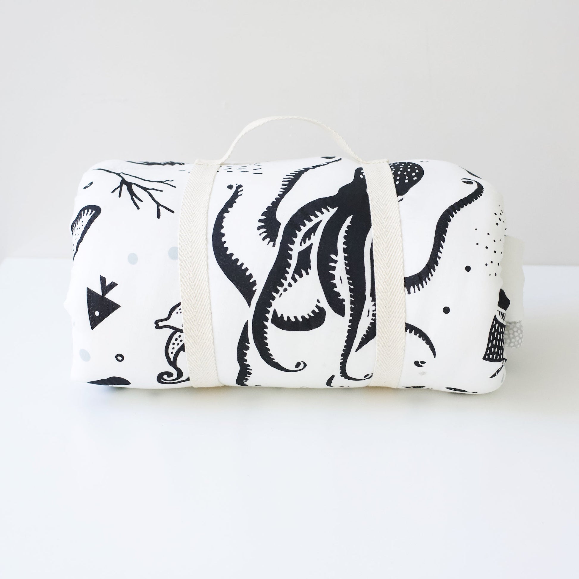 This reversible playmat features hand illustrated ocean animals on one side and a lovely neutral pattern on the other. Made in India using organic traditional fabrics. The outer fabric is a double layer of organic voile, making it super soft, and a poly-fiber stuffing that makes it machine washable for convenience. High contrast graphics and reversible two-sided pattern make it ideal as a playtime setting for baby development.