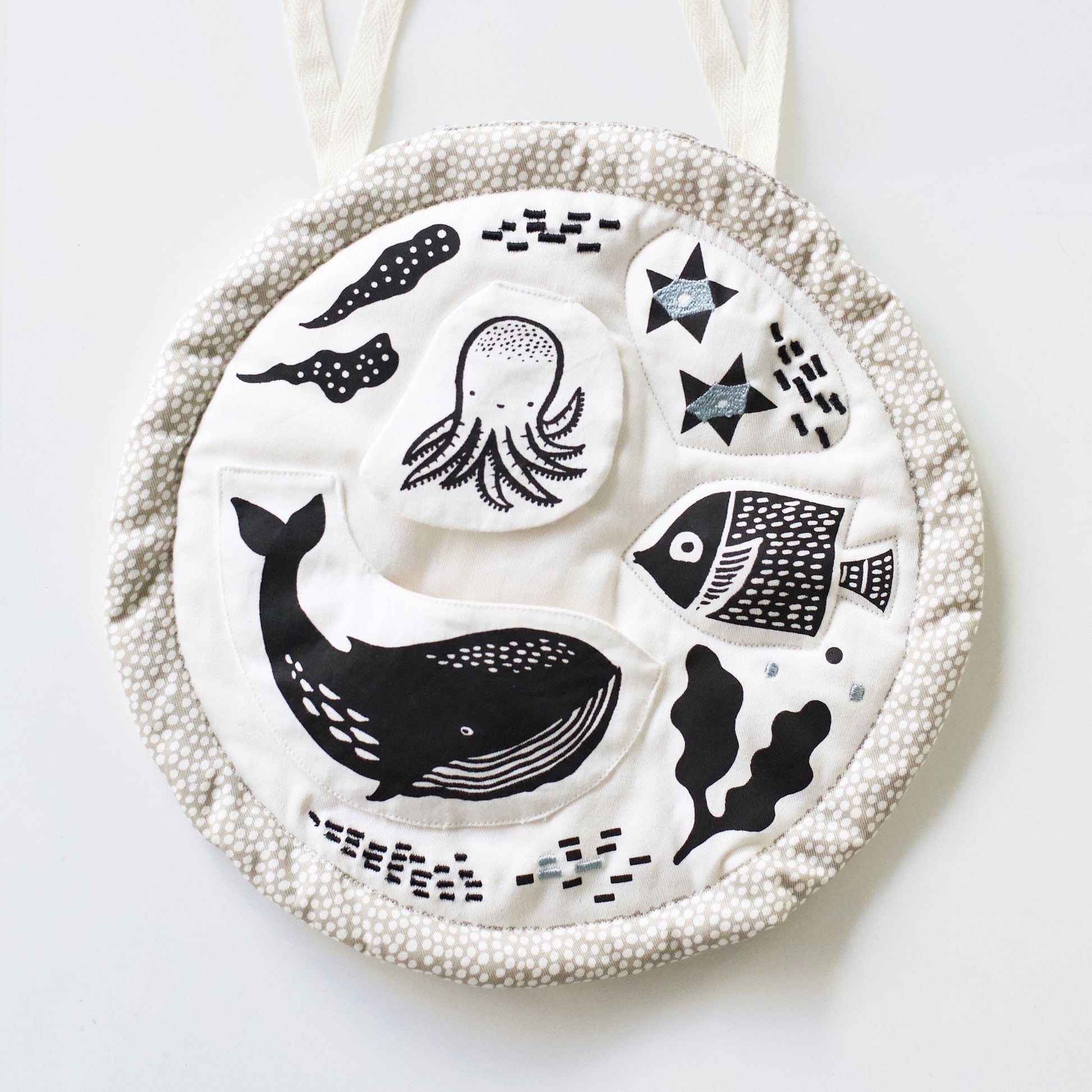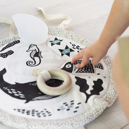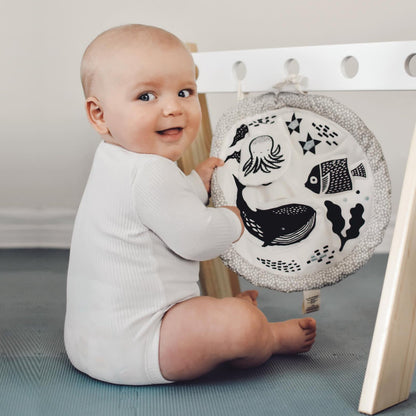 The Ocean Activity Pad keeps your baby stimulated with a variety of sensory stimulation from high contrast graphics, and hidden items including crinkly features, a rattle, a squeak and a maple wood teething ring hidden behind the Whale.