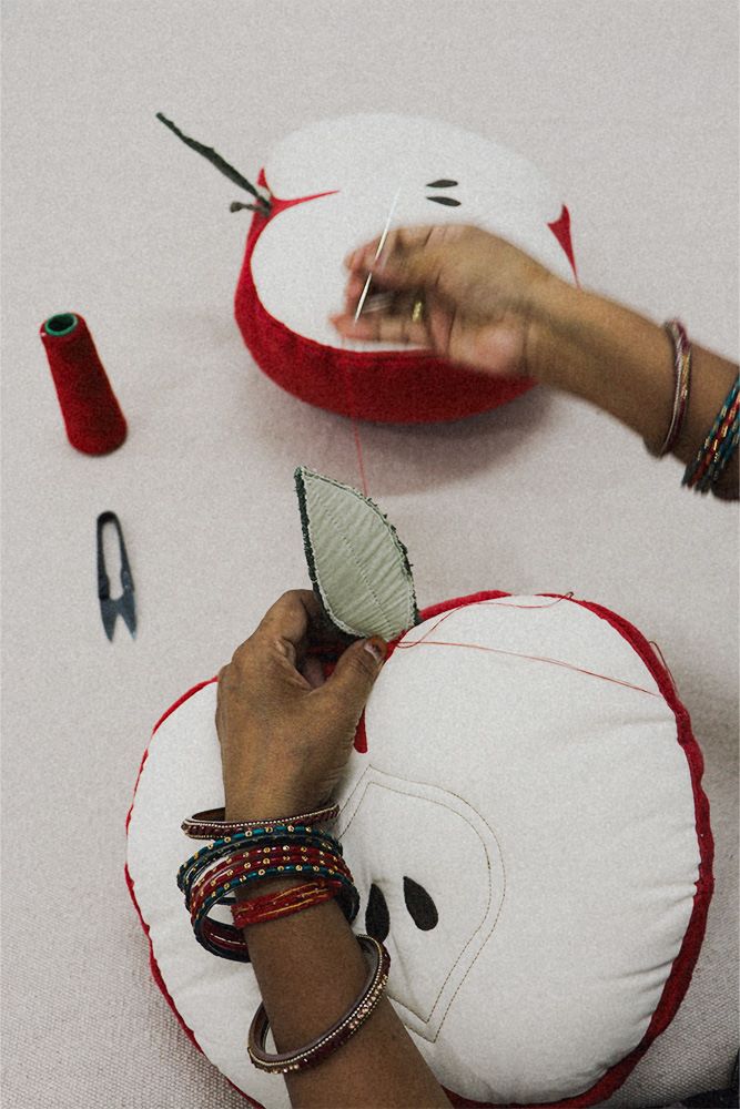 cushion is shaped like a half apple, with a fabric leaf at the top, bringing a