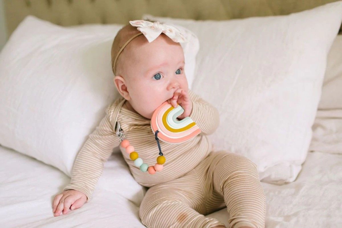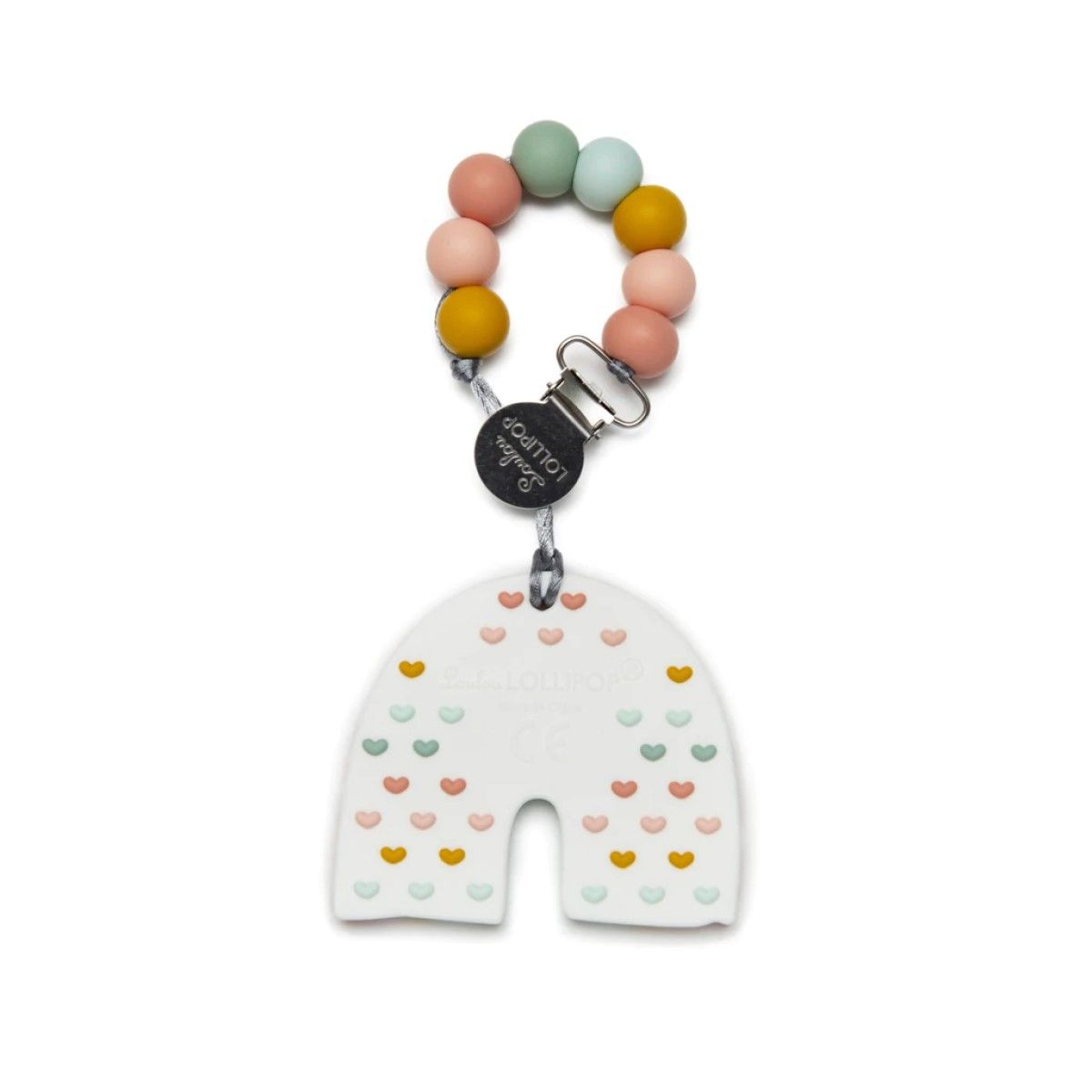 The perfect accessory for that special rainbow baby in your life, this colorful teether offers a full spectrum of relief for sore gums. Made of food grade silicone, it features nubby textures on both sides and a built-in holder with silicone beads and a rust-resistant stainless steel clip. Dreams do come true.