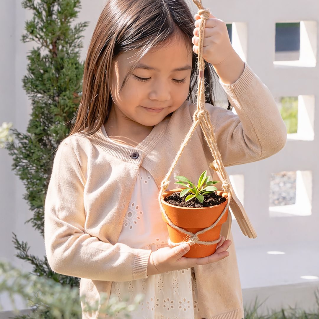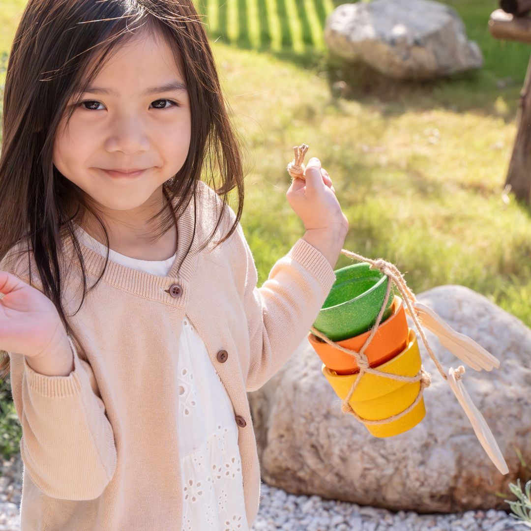 "Where play and nature grow together. Children plant real seeds, scoop soil, and water daily while learning patience, care, and responsibility. As they arrange the colorful pots, use their tiny tools, and observe each sprout, they develop coordination, problem-solving, and a deeper connection with nature through every nurturing moment. The set includes 6 pieces in total, featuring 3 PlanWood pots (green, yellow, and orange), 1 trowel, 1 fork, and 1 hanging rope."