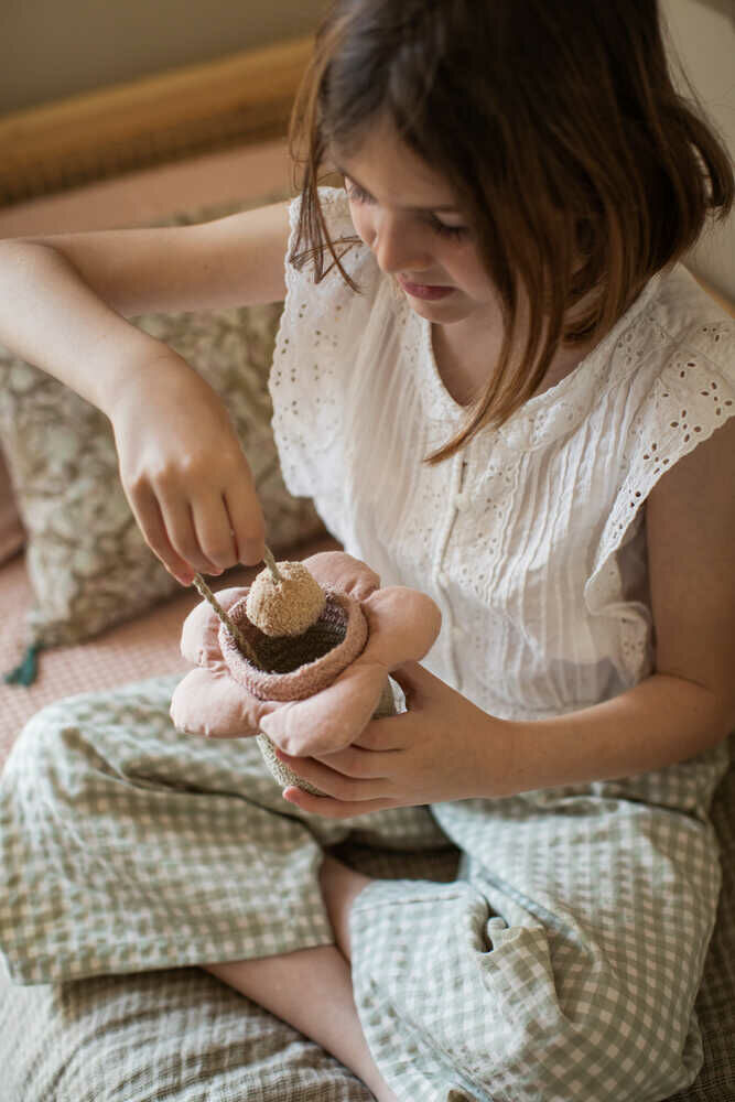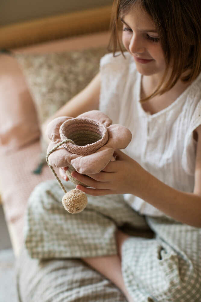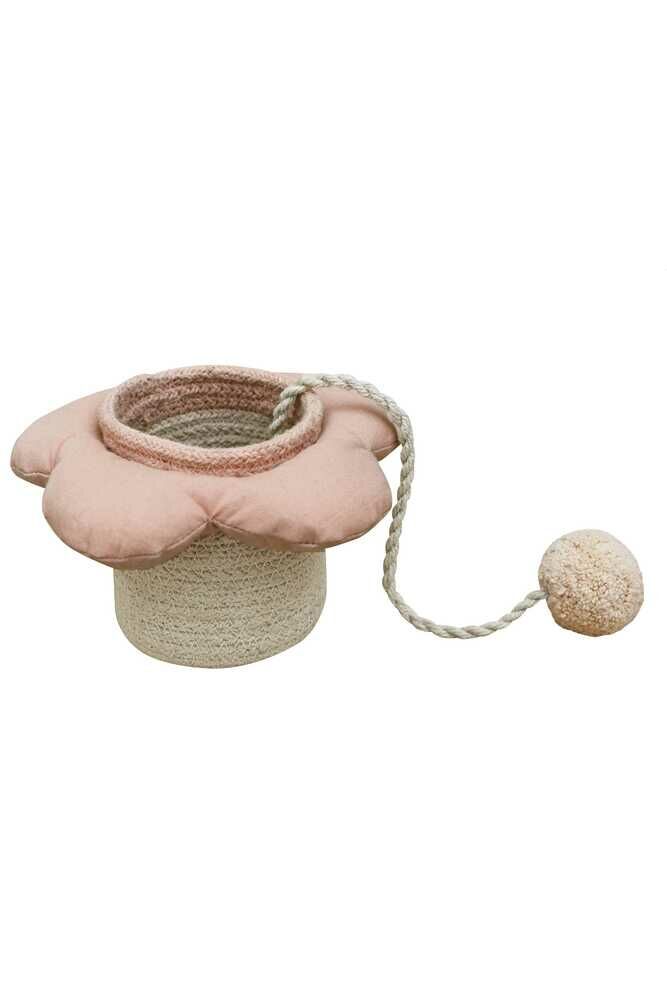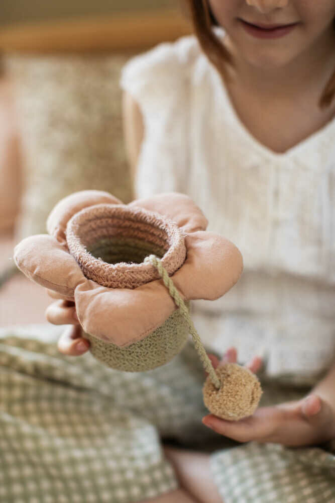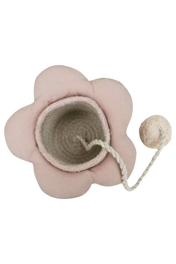 Fling the pompom into the flower! This fun game of cup-and-ball will provide little ones with endless hours of entertainment as they count how many times they can get the pompom ball into the flower basket.