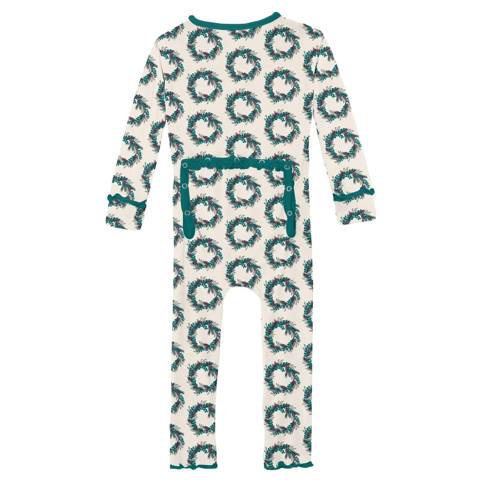 Print Muffin Ruffle Coverall with 2 Way Zipper in Natural Holiday Wreath