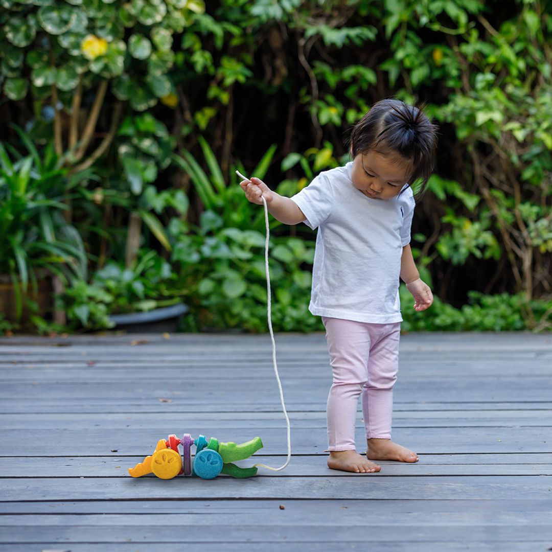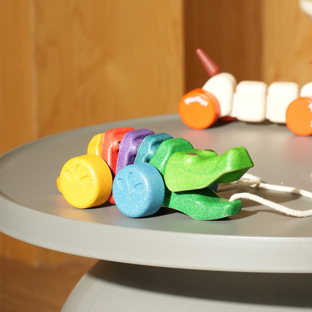 This colorful Rainbow Dancing Alligator is made from PlanWood. When children pull the Alligator, its head and tail move up and down – making a fun click-clack sound.