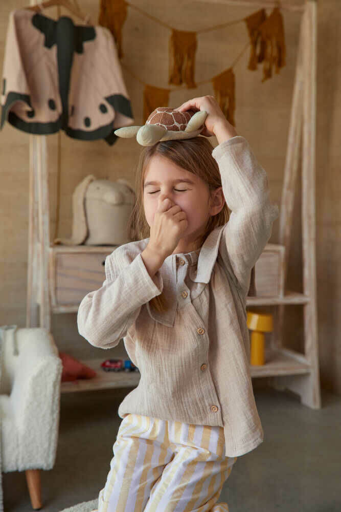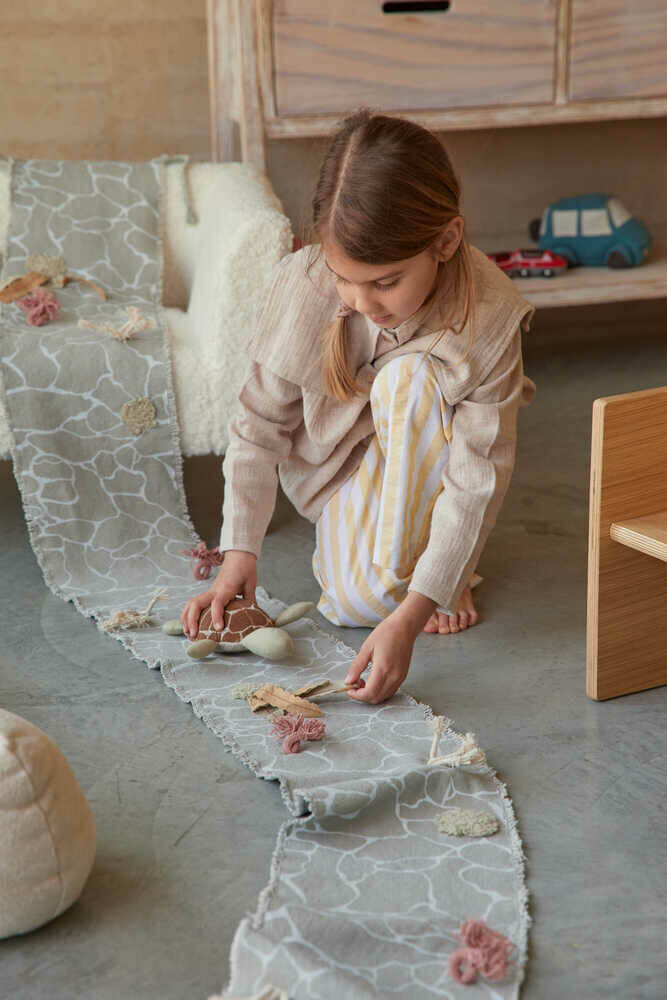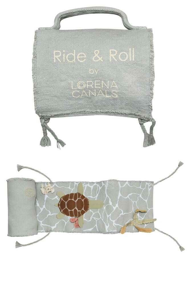 Join the newborn turtle on its journey through the oceans! The Ride & Roll Turtle consists of a soft toy turtle made in cotton canvas, with olive green paws and an embroidered shell. The turtle comes rolled up in a 4 mtr long canvas roll in blue sage color, featuring the magic world of the bottom of the sea with its multicolor corals and the reflections of the water printed on top.