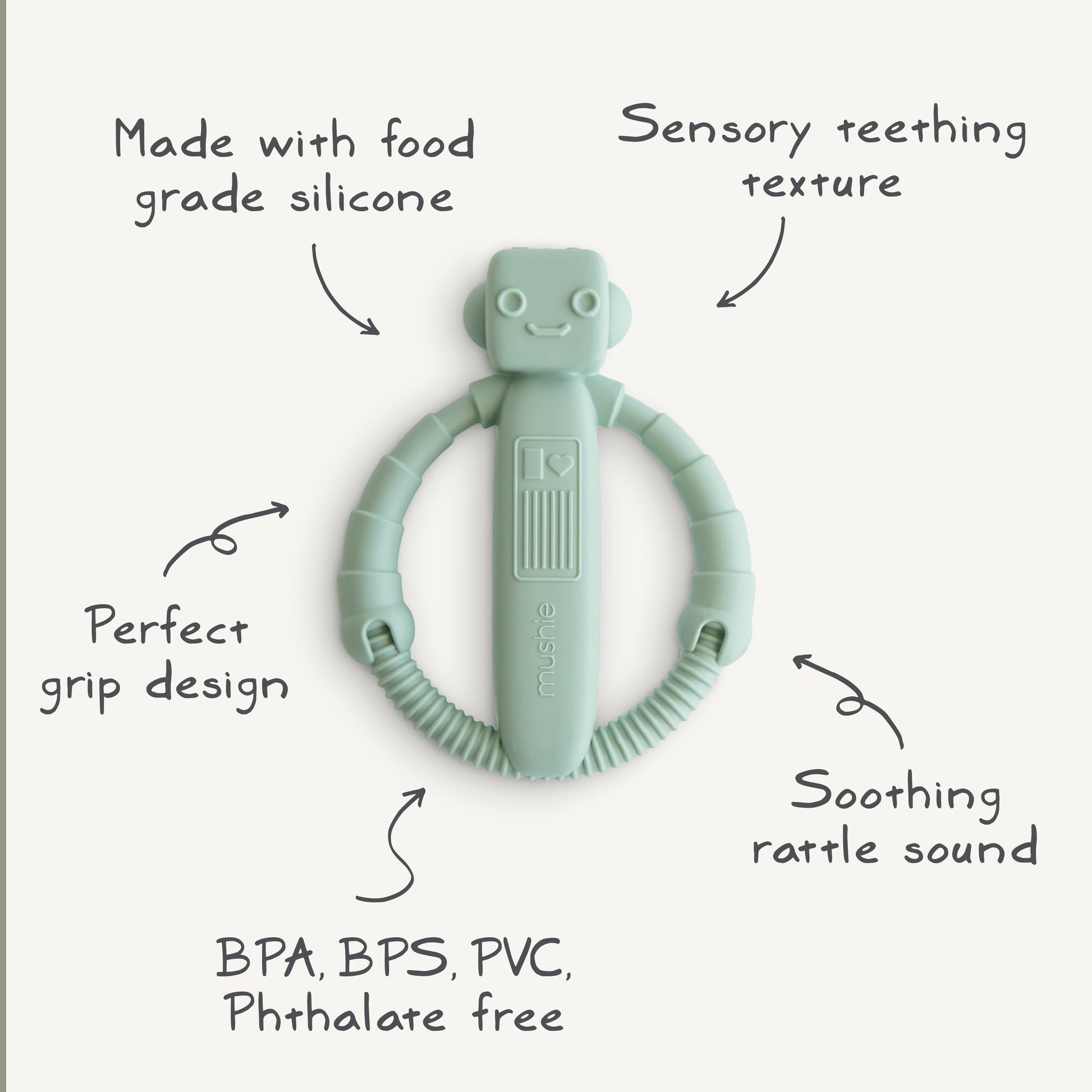 Inspired by technology and designed with functionality and comfort in mind, our silicone Robot Rattle Teether features a playful robot shape and built-in rattle. The cheerful sound engages baby’s auditory senses for added soothing relief.