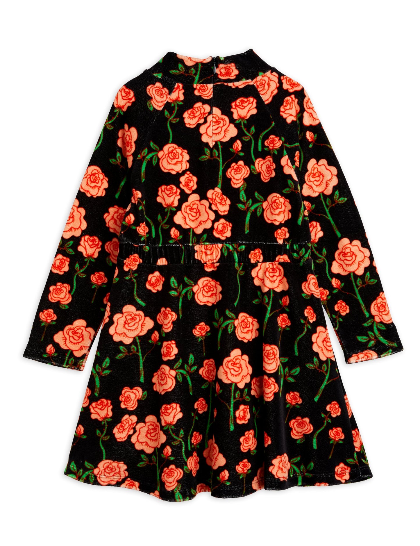 Black velour dress with Roses print made from 100 % GOTS certified organic cotton. The dress is designed with a high neck, a hidden zipper in the back for easy dressing, an elastic waist and a short flowy skirt.