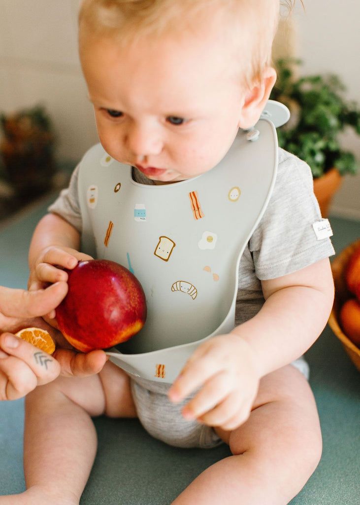 LouLou Lollipops silicone bibs are buttery soft, waterproof, and stain-resistant. It is easy to clean; simply wipe down for a quick cleaning or put it in the top rack dishwasher for a deep clean. It features a wide catch-all pouch that sits below a high chair tray – perfect for collecting food, crumbs, and spills. Reinforced buttonholes for a durable and adjustable fit for long-lasting wear, suitable for ages 3 - 36 months. This handy bib is available in various modern colors and fresh designs to make mealtime fun and enjoyable.