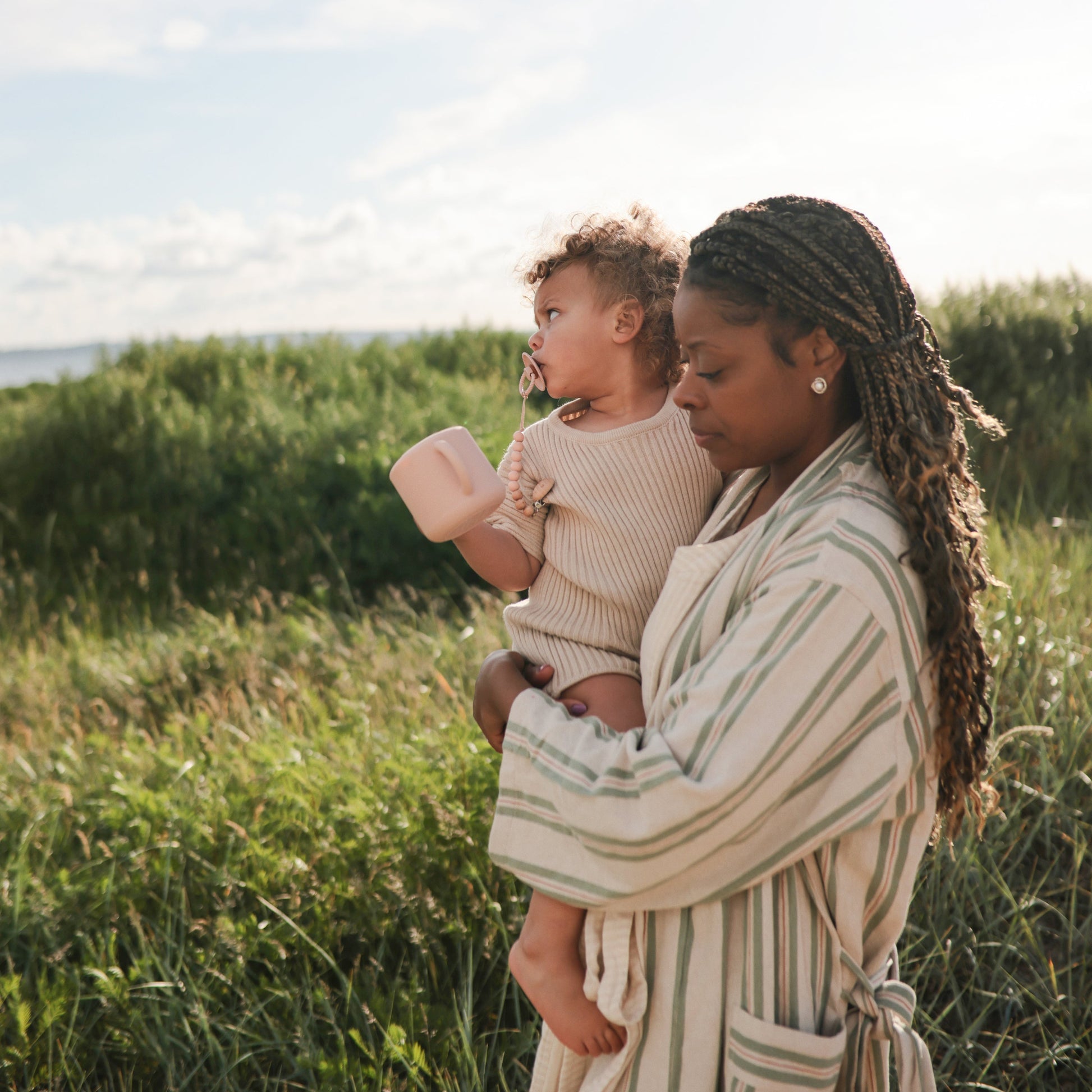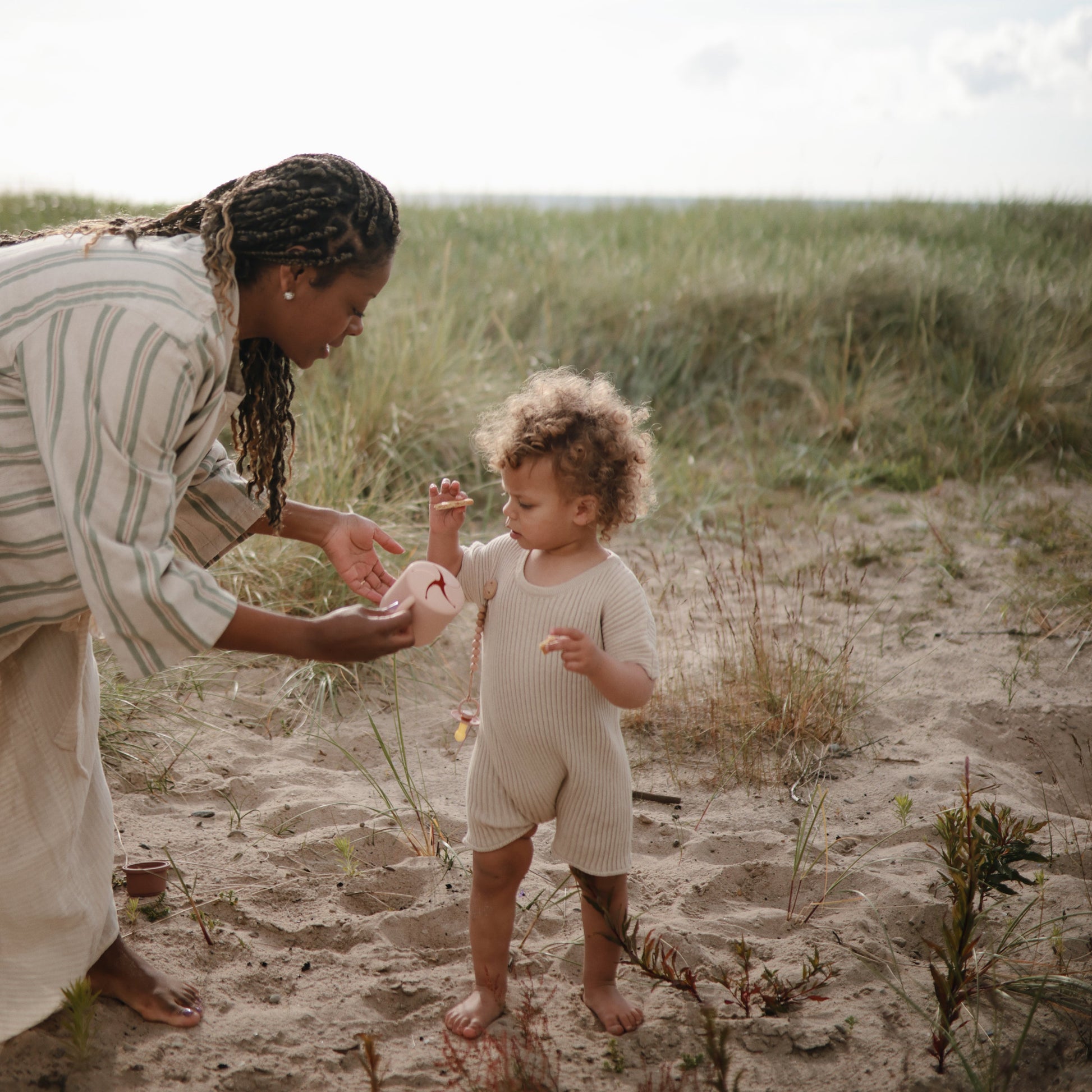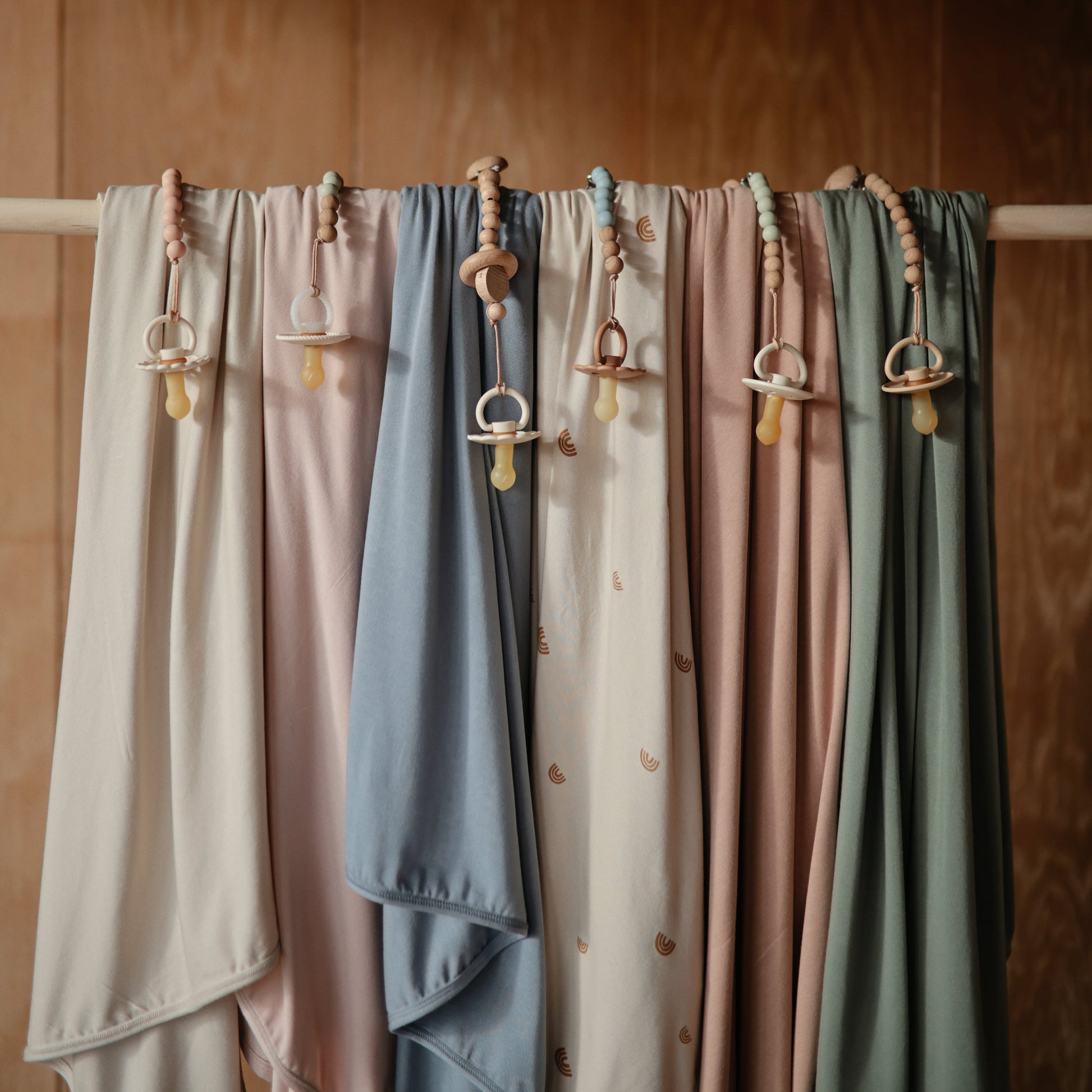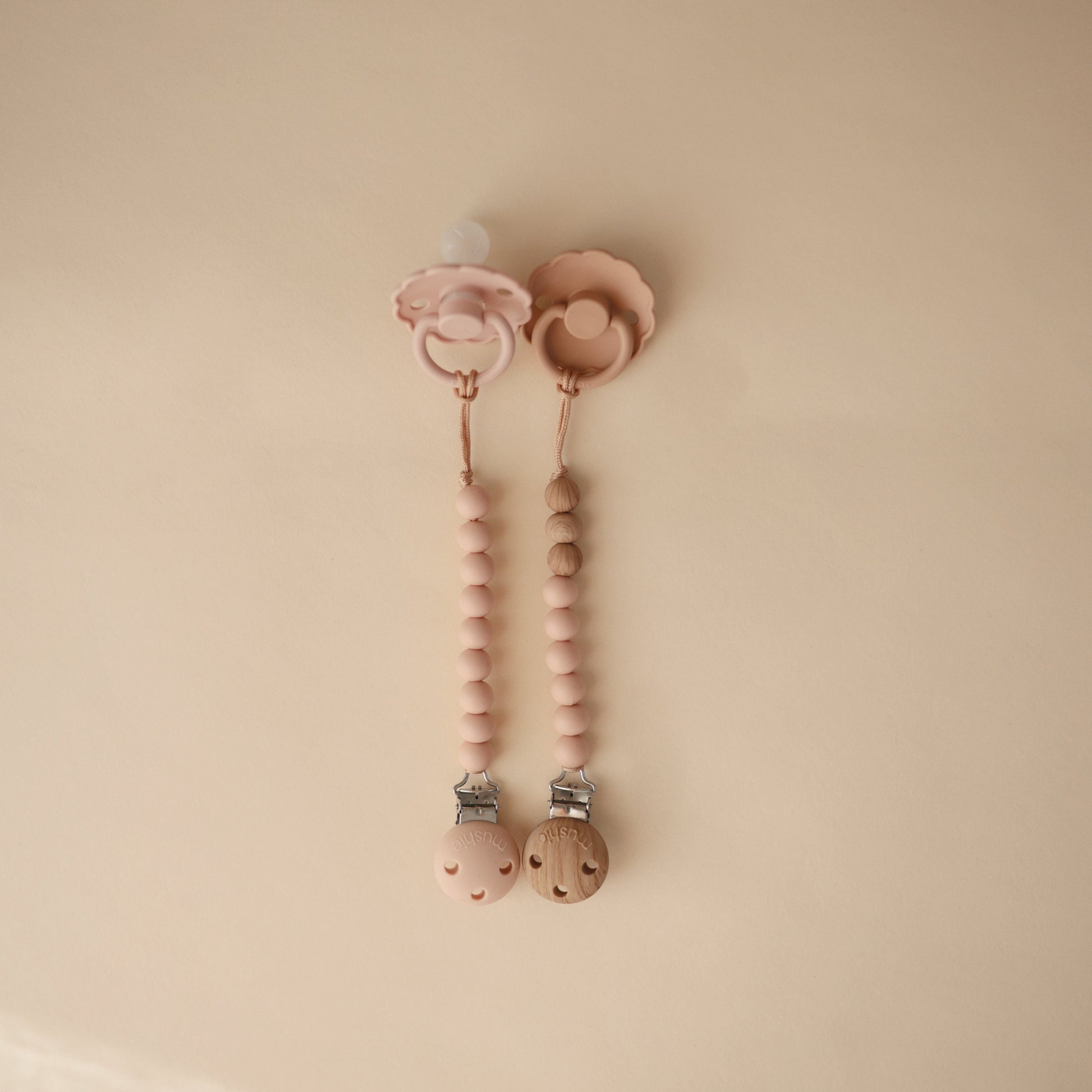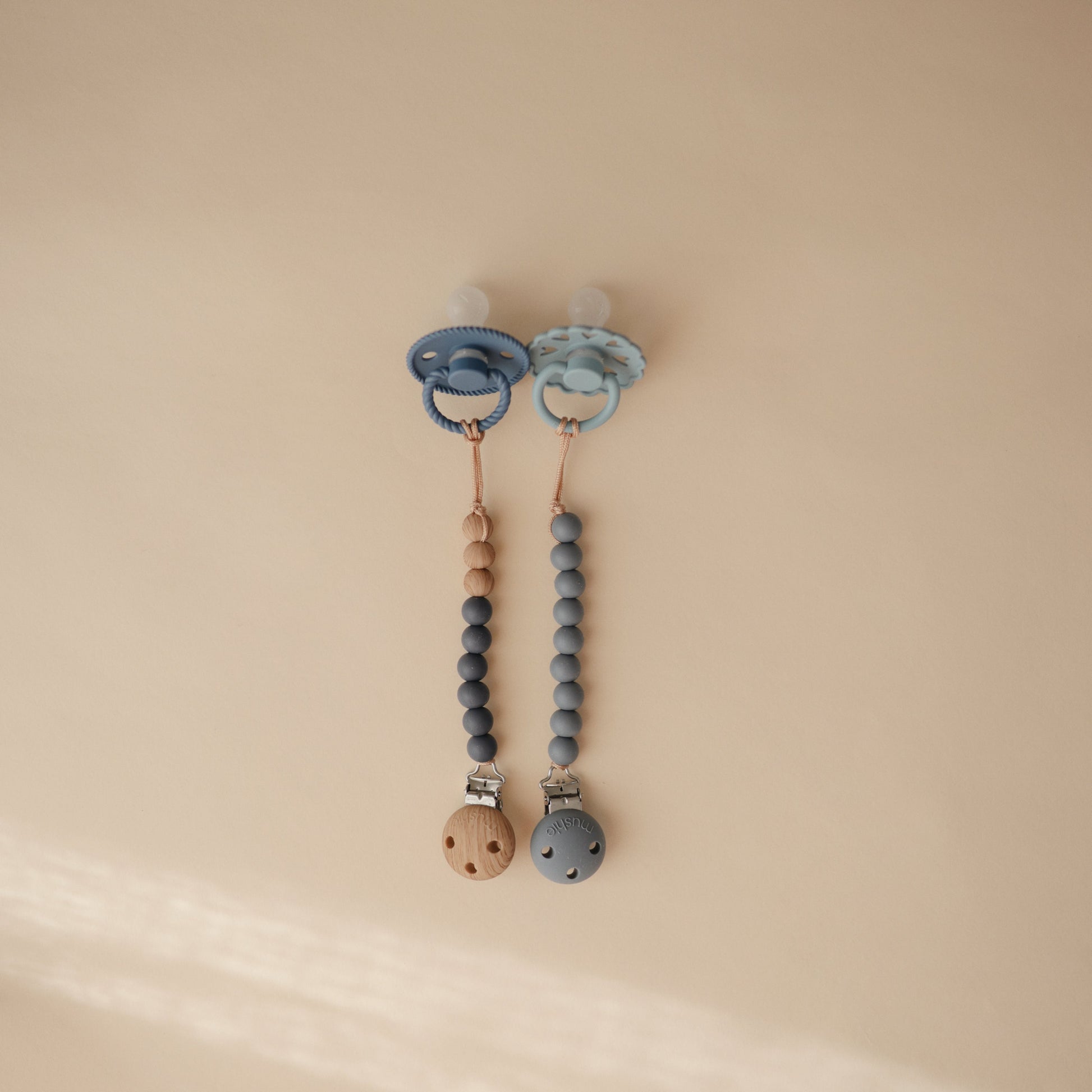 The Mushie silicone pacifier clip offers durability, function and simplicity to families on-the-go. Made from 100% food-grade silicone, our clip features a faux wood silicone clasp that brings a modern take to a traditional favorite. With a simple stack of silicone beads in two complementary colors, the Eva clip offers a sophisticated touch to your pacifier accessories. The clip is easy to clean and helps keep soothing items in reach for little ones.