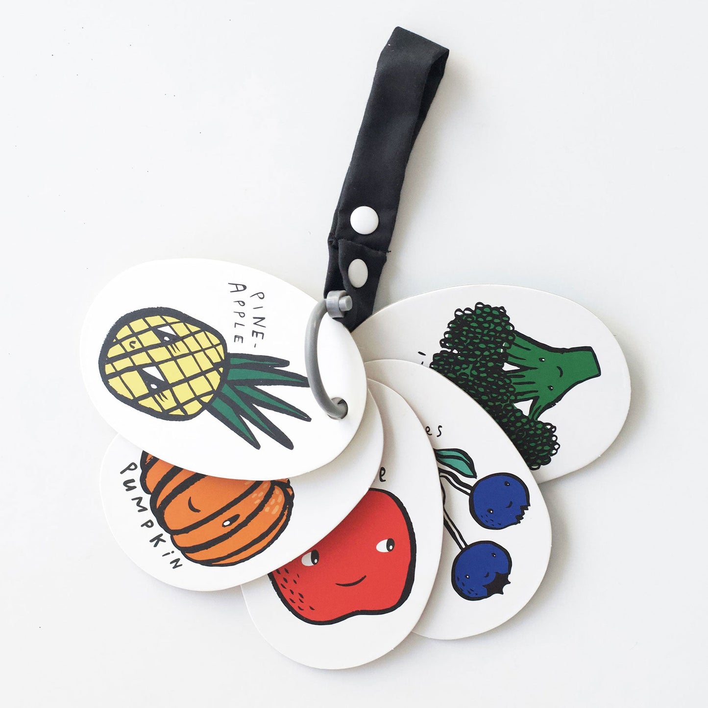 I see Fruits and Veggies in the Market! The "I See"™ Stroller Cards promote exploring a baby's world with simple, open-ended prompts. Spot fruits and veggies that are commonly seen while at the market, and begin to explore color recognition. These five beautifully illustrated cards are super sturdy and held together with a ring and strap that connect to your stroller or bag. Easy to take on a trip but not easy to lose. Take your baby on a fun exploration the Wee Gallery way.
