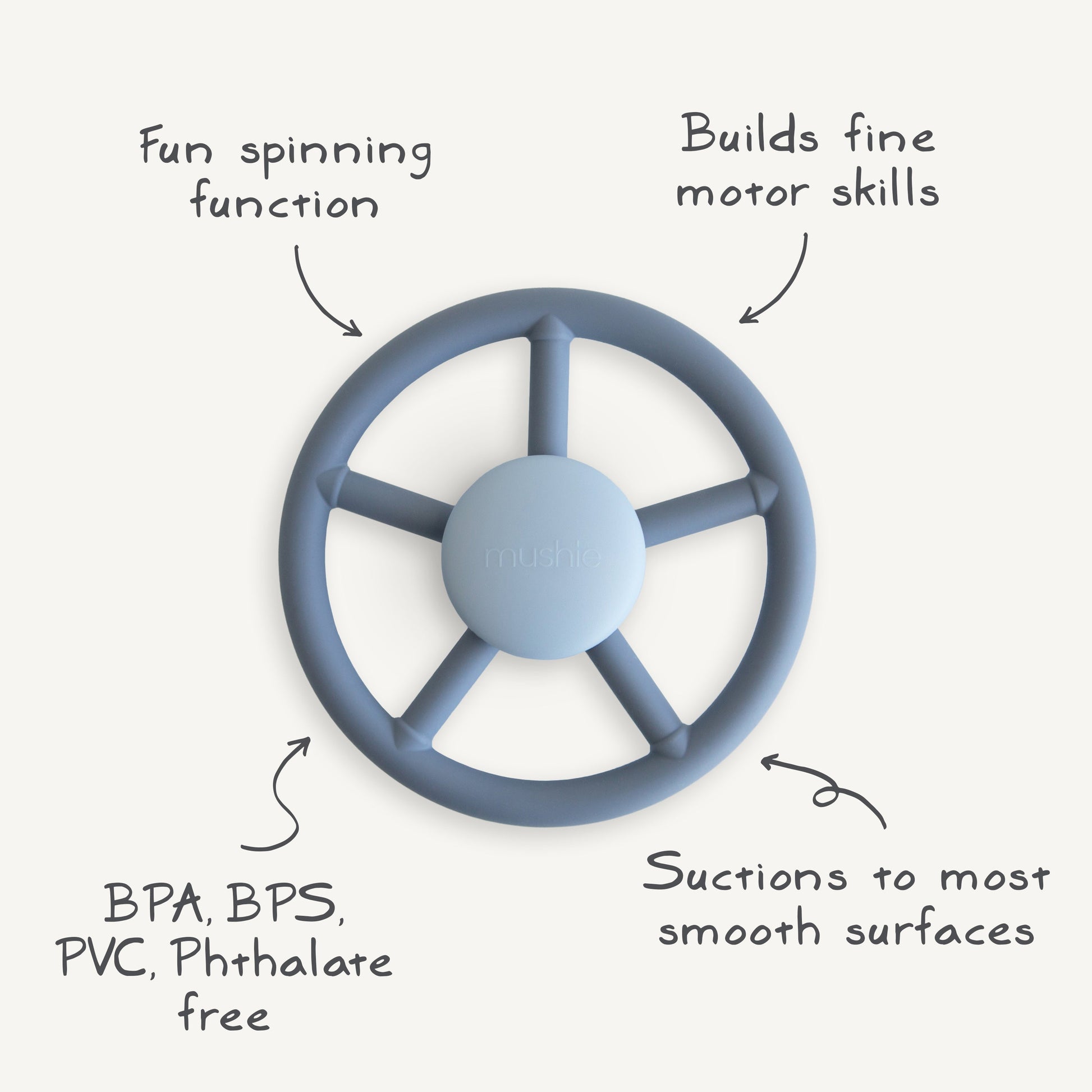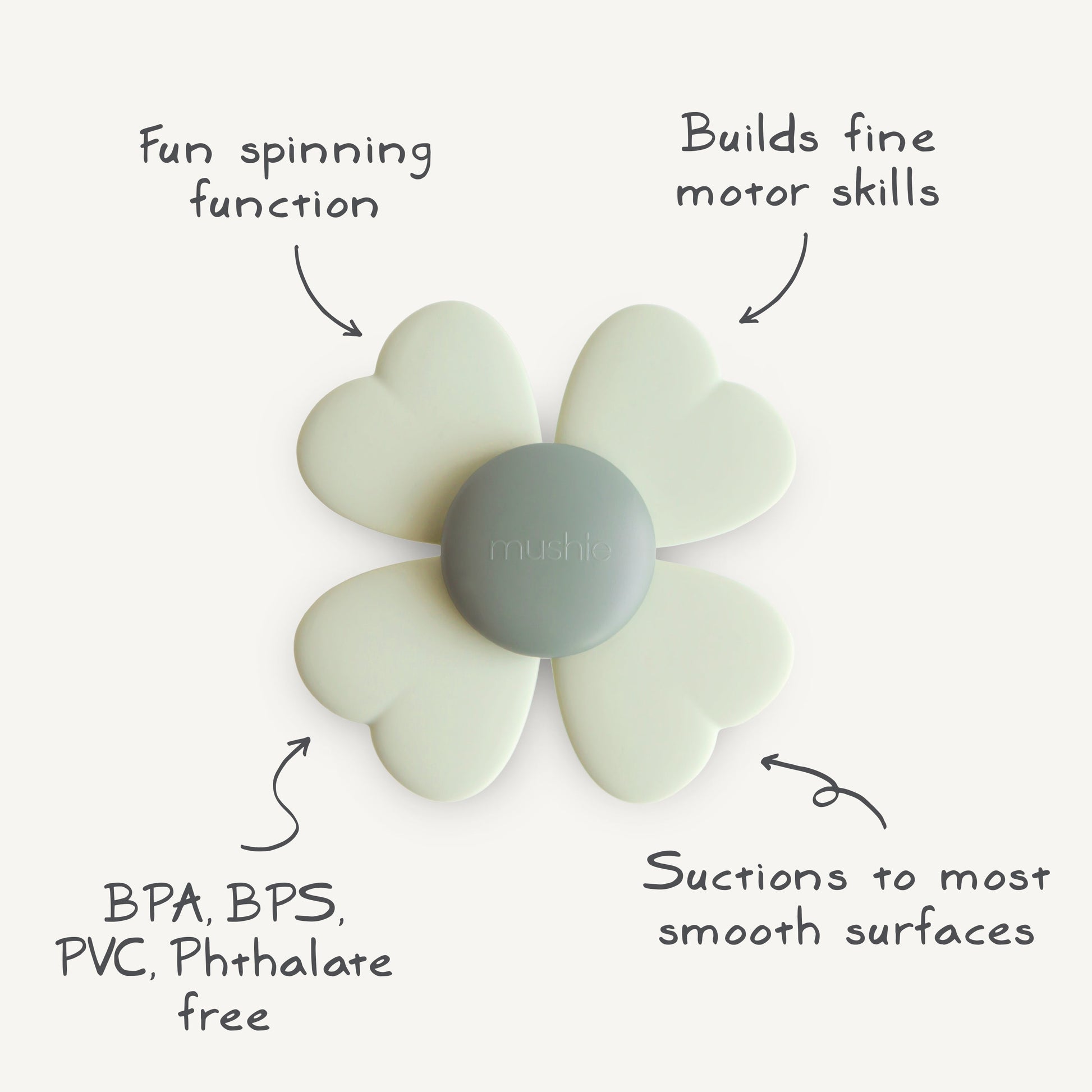 Captivate and calm with our suction spinner toys. Featuring playful designs crafted from soft, food-grade silicone, these spinners are designed to spark imagination and encourage independent discovery. Whether suctioned to a highchair or the bathtub at home or an airplane tray on the go, they provide a peaceful, sensory experience for your little one anywhere.