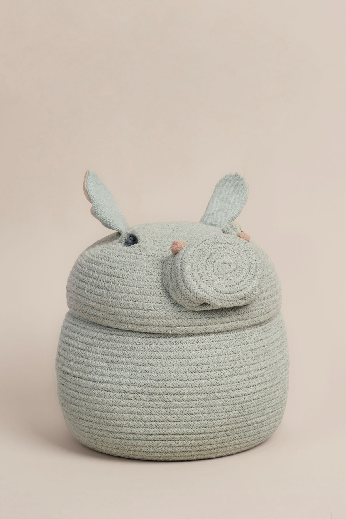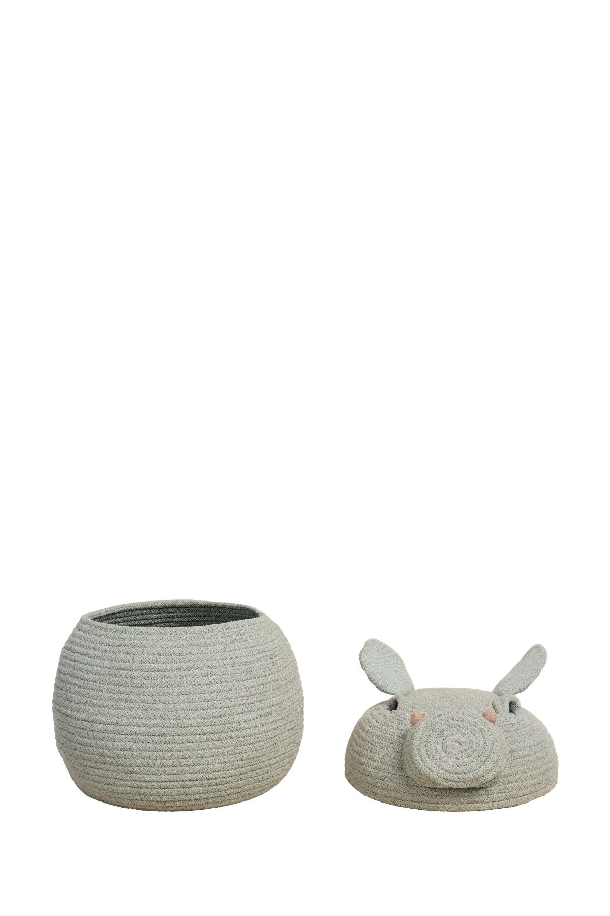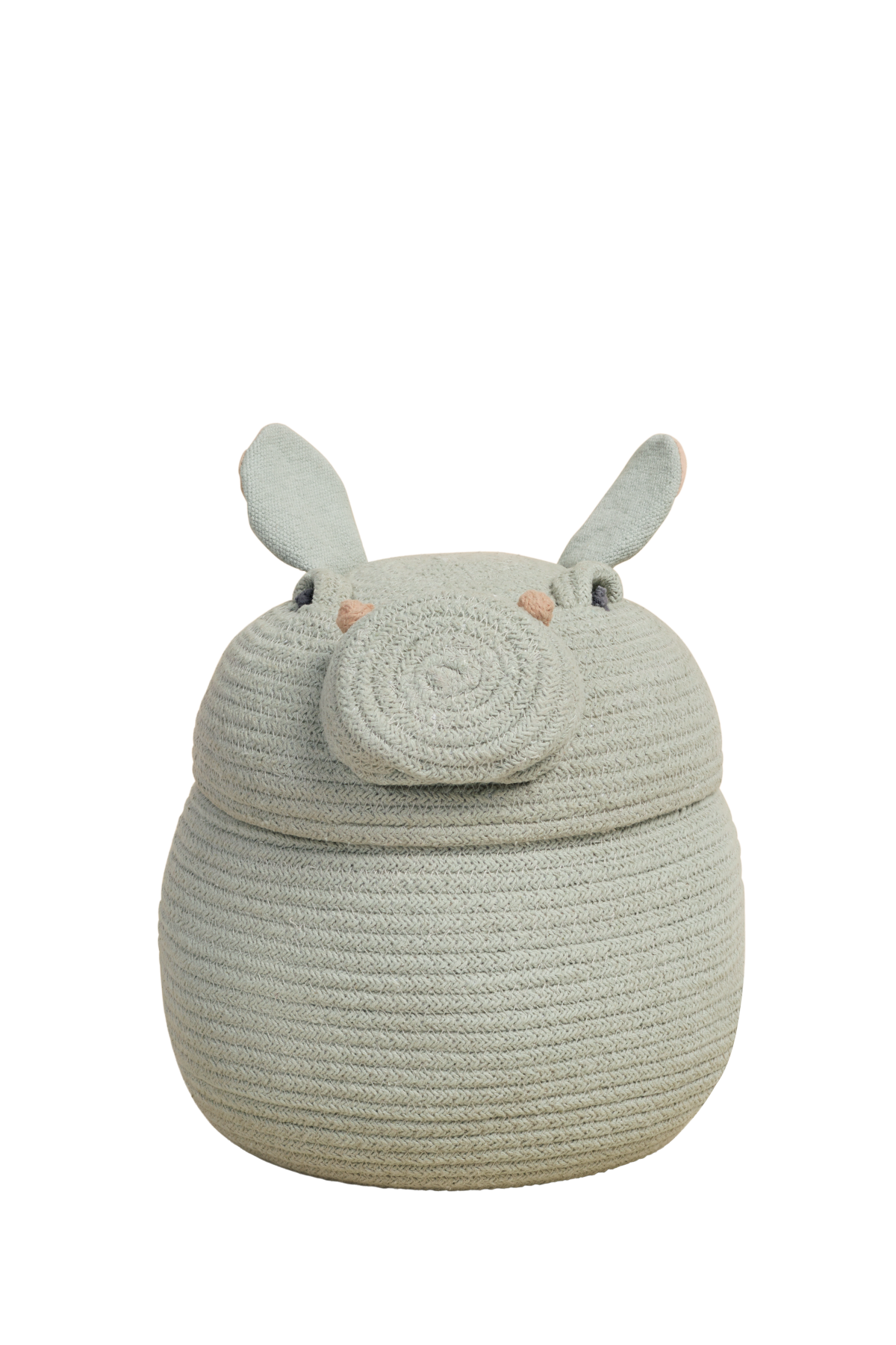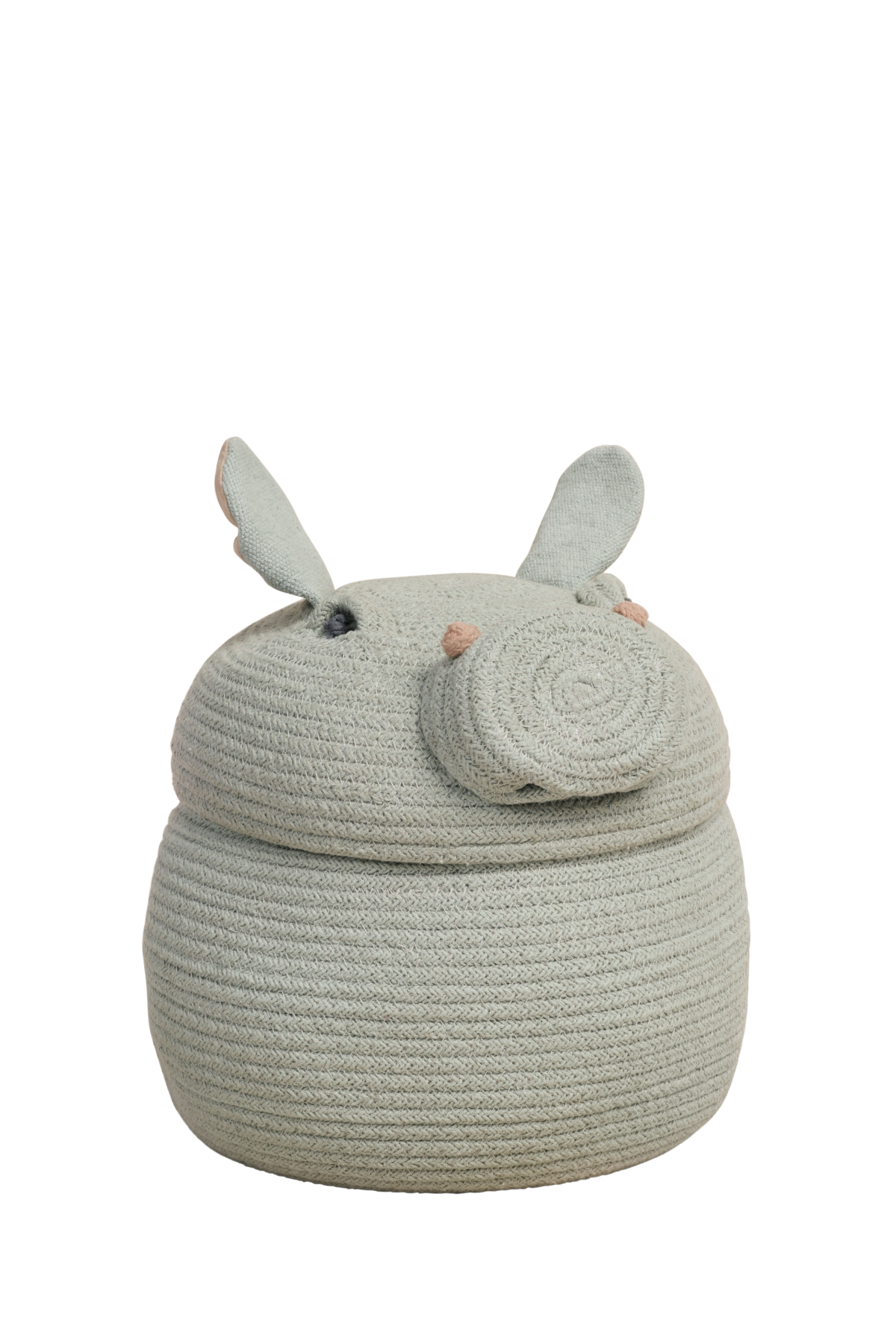 As happy as a Hippo! With a slightly round-shaped lid, the Henry the Hippo basket is handcrafted using a braided cord made of fibers from recycled PET bottles mixed with our Blue Sage cotton. With ears in matching color canvas and knotted pink nostrils, your hippo friend will keep your little treasures safe.